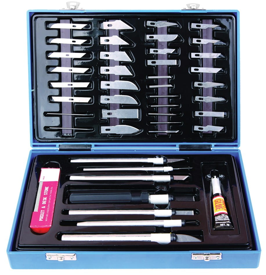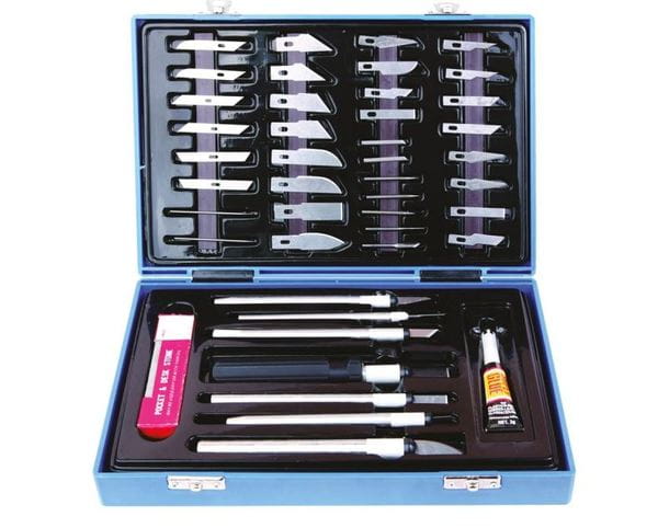 42-elementowy zestaw nożyków, skalpeli, dłutek, skrobaków, szpikulców niezbędnych np. przy pracach modelarskich.
