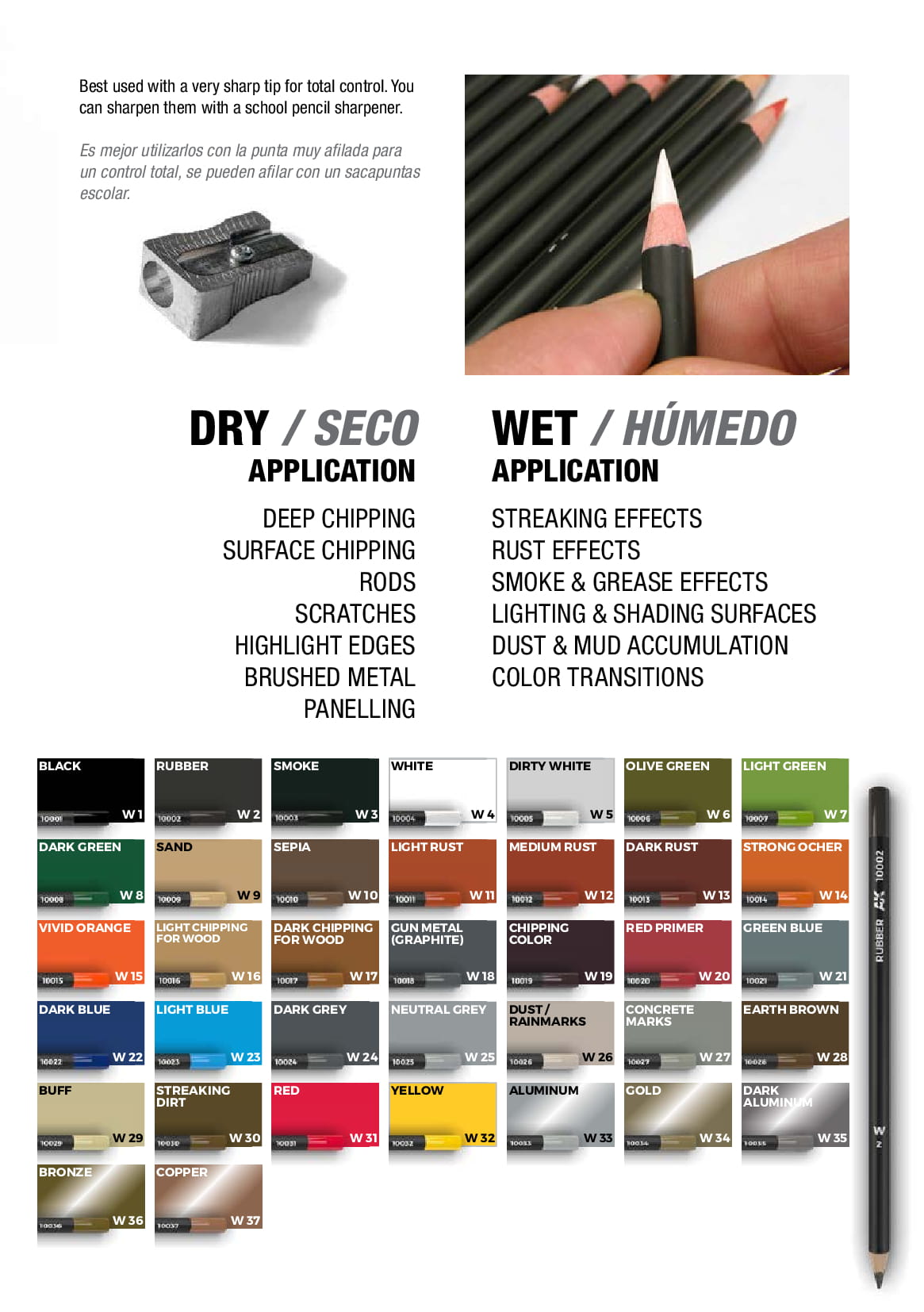 Kredki do weatheringu to kredki na bazie wody z 17-centymetrową półtłustą farbą, specjalnie do użytku w modelarstwie. Te kredki do weatheringu mają specjalnie opracowaną formułę z najbardziej odpowiednimi kolorami podstawowymi, aby uzyskać wszystkie efekty w bardzo prosty sposób.