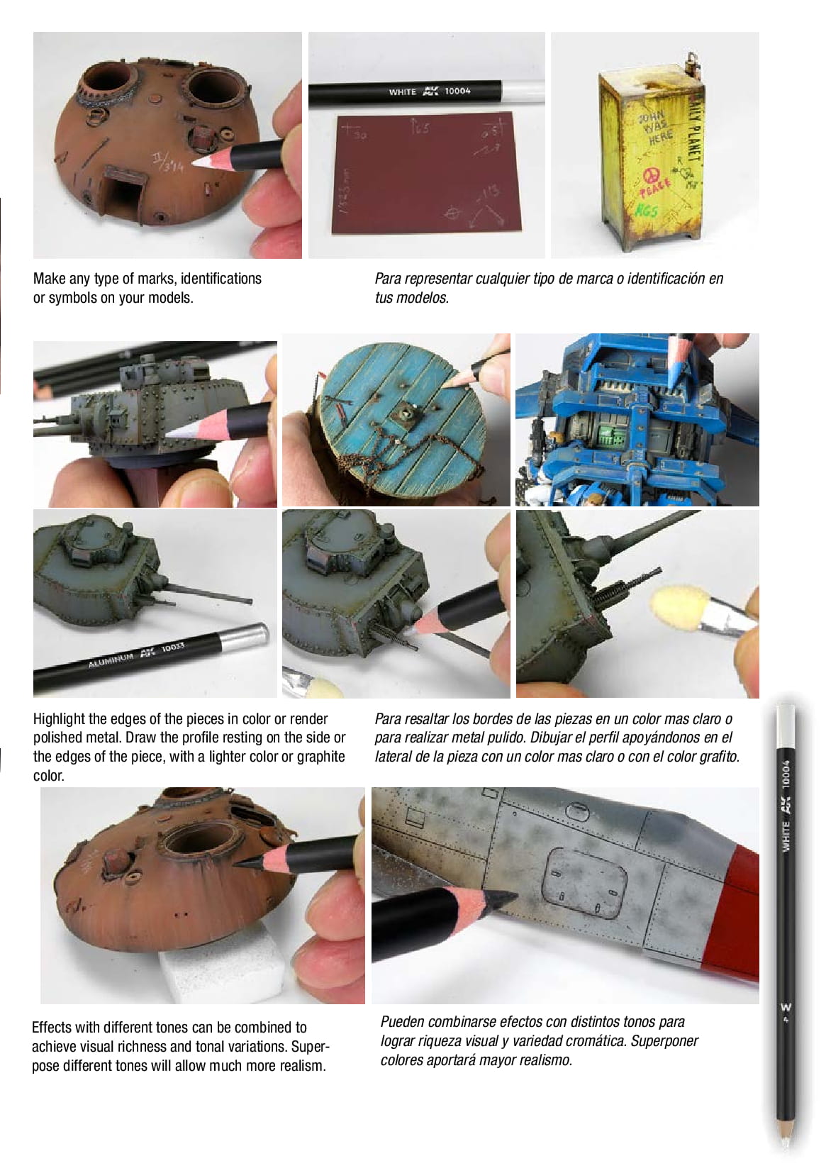 Kredki wodne z farbą to łatwy i precyzyjny sposób wykonywania różnych efektów weatheringu; mogą być nakładane na sucho, w zależności od potrzeb można korygować i rozmywać efekt na powierzchni modelu poprzez przemywanie pędzelkiem zwilżonym wodą. Dla najlepszych rezultatów producent zaleca nakładanie na matowych powierzchniach.
