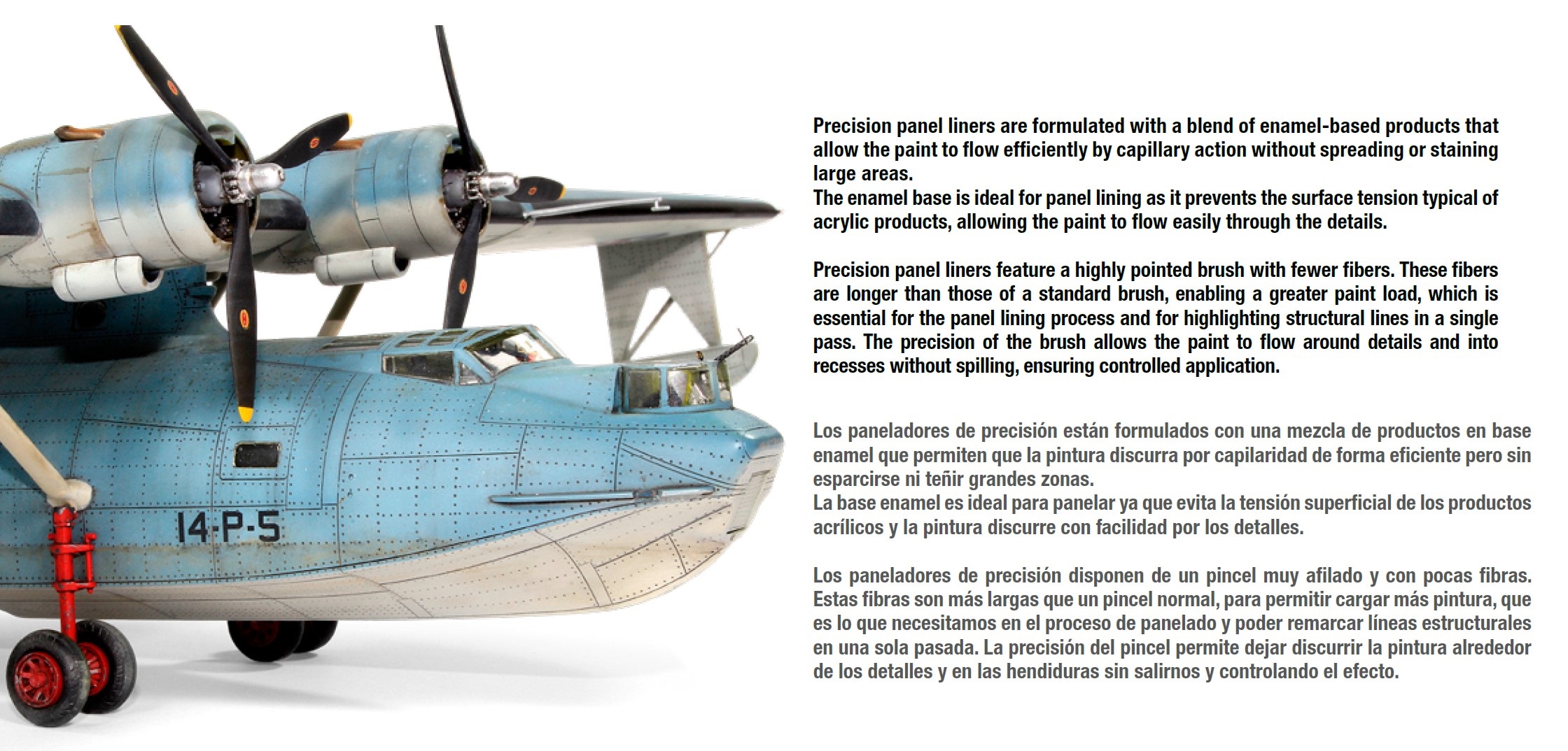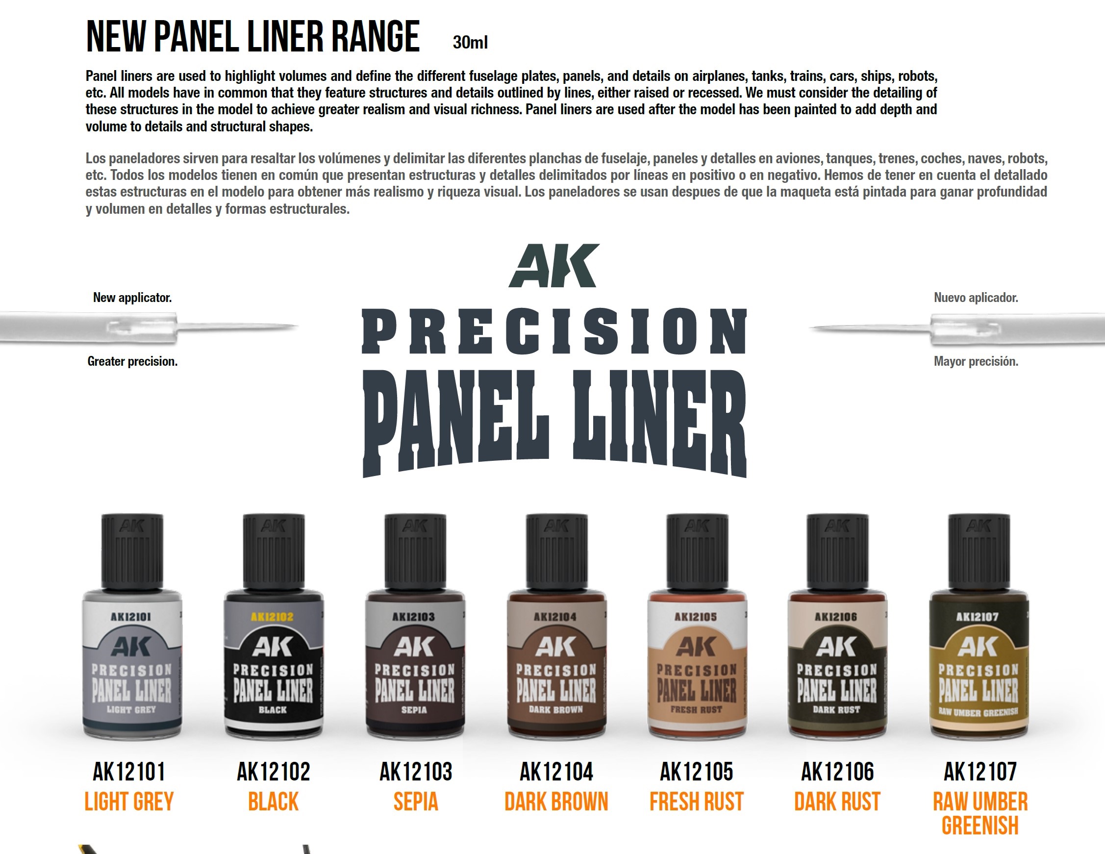 AK Interactive Precision Panel Liners to profesjonalne linery emaliowe stworzone specjalnie do podkreślania paneli, linii konstrukcyjnych i detali na modelach plastikowych. Formuła oparta na emalii gwarantuje doskonały przepływ farby kapilarnie, bez rozlewania się i bez niepożądanego plamienia większych powierzchni. Dzięki temu panel lining staje się szybki, czysty i niezwykle precyzyjny.
