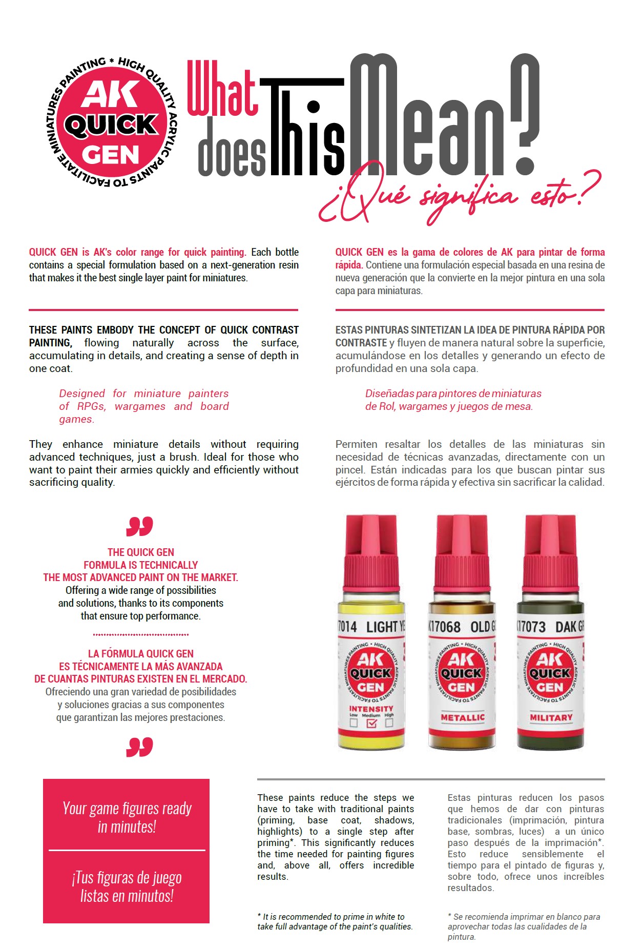 AK QUICK GEN to nowa, zaawansowana technologicznie seria farb akrylowych marki AK Interactive, stworzona z myślą o szybkim i efektownym malowaniu figurek i modeli do gier bitewnych, RPG i planszowych.