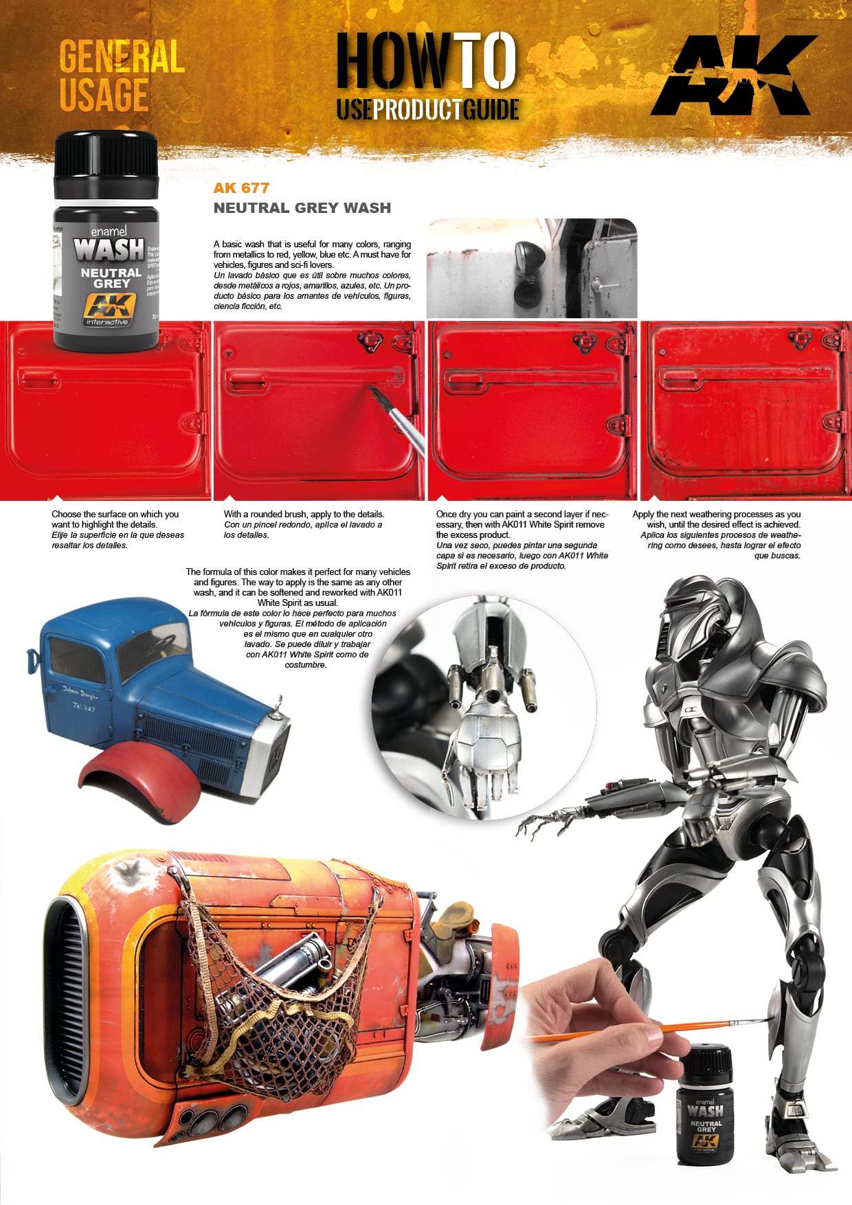 Podkreśl najgłębsze szczegóły swoich modeli, nakładając te doskonale rozcieńczone farby emaliowe. AK Washes można rozcieńczyć, a także usunąć za pomocą White Spirit lub Bezzapachowej Terpentyny.