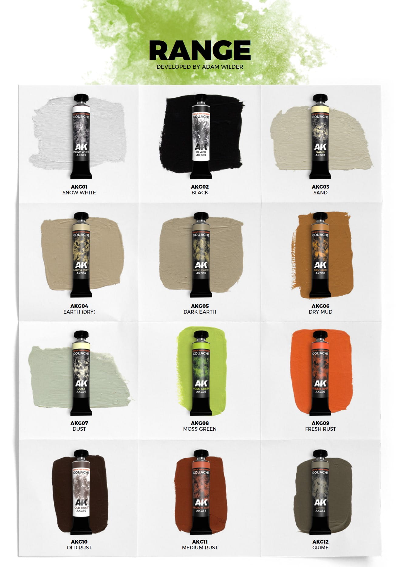 Seria AK Interactive GOUACHES występuje do zakupu oddzielnie w tubkach: AKG01 do AKG12 oraz w postaci dwóch zestawów:
