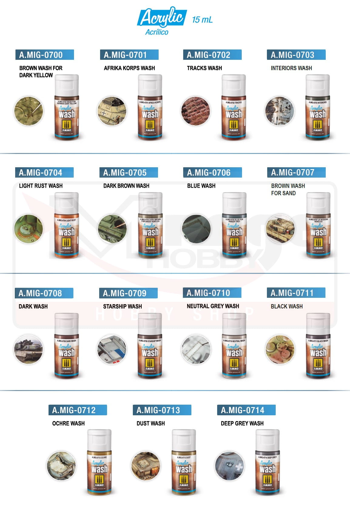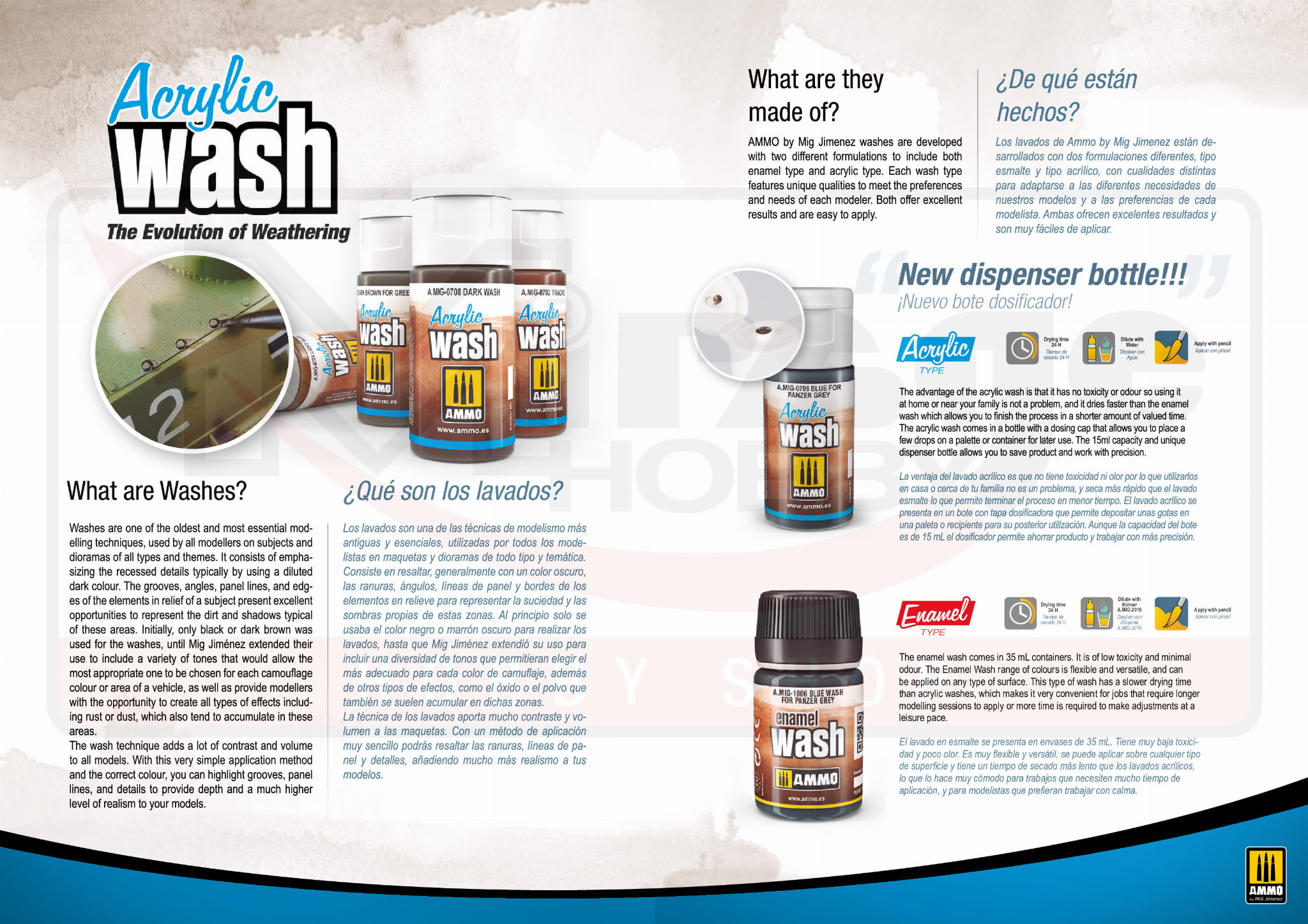 Washe AMMO by Mig Jimenez opracowano w dwóch różnych formułach, zarówno - emaliowanych, jak i akrylowych. Każdy typ charakteryzuje się inną jakością, aby dostosować się do różnorodnych potrzeb naszych modeli i preferencji każdego modelarza. Obydwa dają doskonałe rezultaty i są bardzo łatwe w aplikacji.