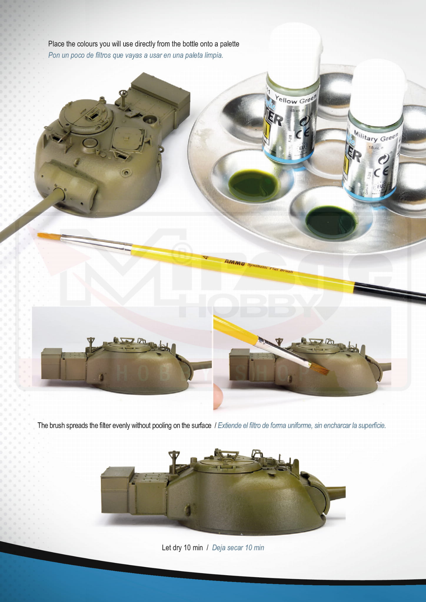 Filtry są łatwe w aplikacji. Wystarczy użyć okrągłego pędzla o grubości dostosowanej do wielkości modelu. Po wstrząśnięciu nałóż odpowiednią ilość na pędzel. Następnie rozprowadź filtr gładko i równomiernie na powierzchni, unikając gromadzenia się w rowkach lub detalach. Filtr należy rozprowadzać poprzez zwilżenie powierzchni, bez jej moczenia. Nie powinien gromadzić się ani tworzyć kałuż na żadnej powierzchni. Możesz zastosować filtry o różnych kolorach nałożone na warstwy lub strefy, stosując konkretny filtr do jednej powierzchni i inny filtr, aby wyróżnić inną powierzchnię. Upewnij się, że powierzchnia jest matowa, a nie błyszcząca.