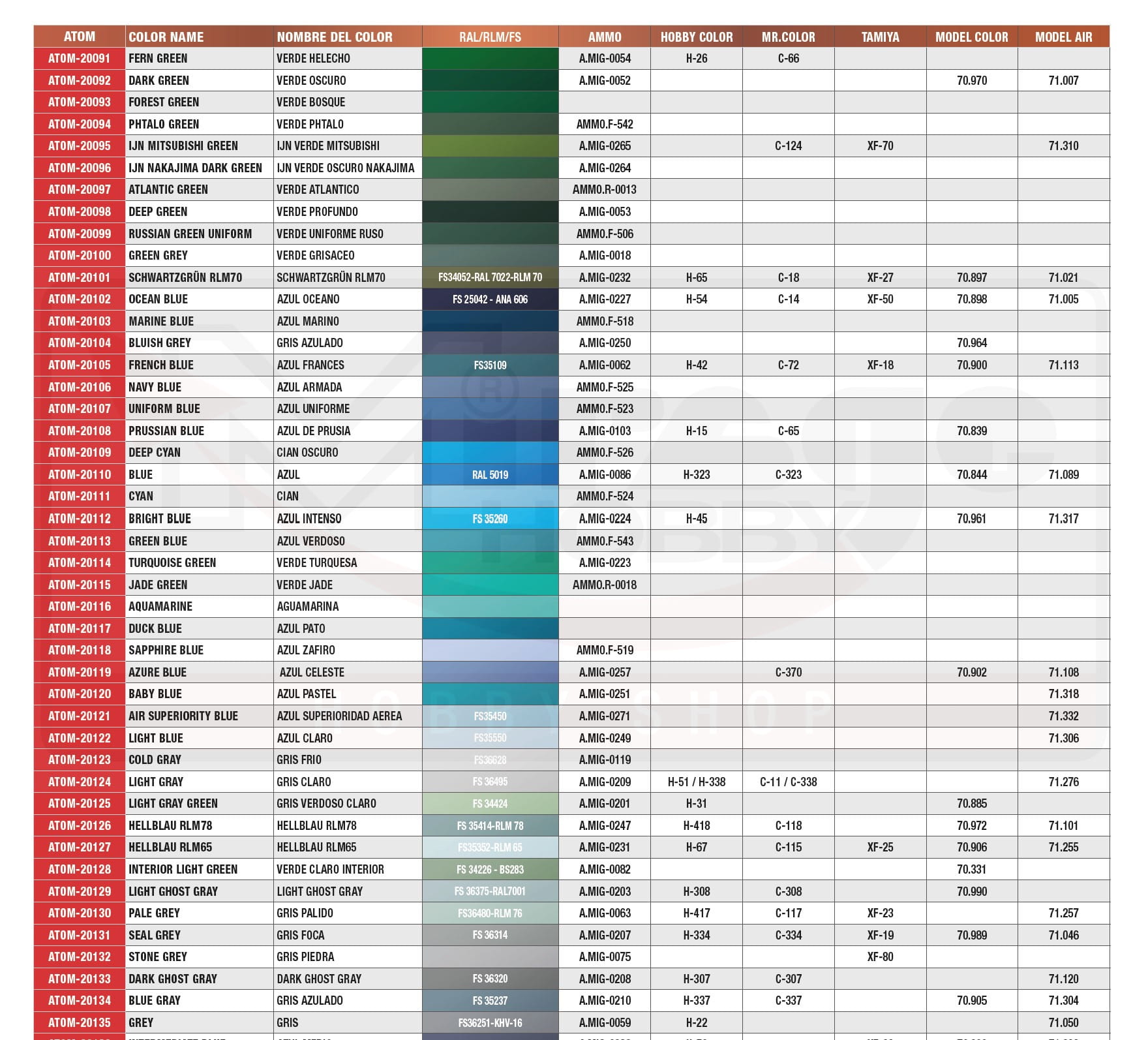 Gama farb Ammo ATOM obejmuje 180 kolorów obejmujących bardzo szeroki zakres chromatyczny, od kolorów podstawowych, jasnych i intensywnych, po kolory metaliczne i zmywalne. Zawiera również specjalnie opracowany rozcieńczalnik dla całego asortymentu. Ponadto gama ATOM obejmuje również historycznie dokładne kolory zarówno dla schematów kamuflażu samolotów, jak i opancerzonych pojazdów bojowych.