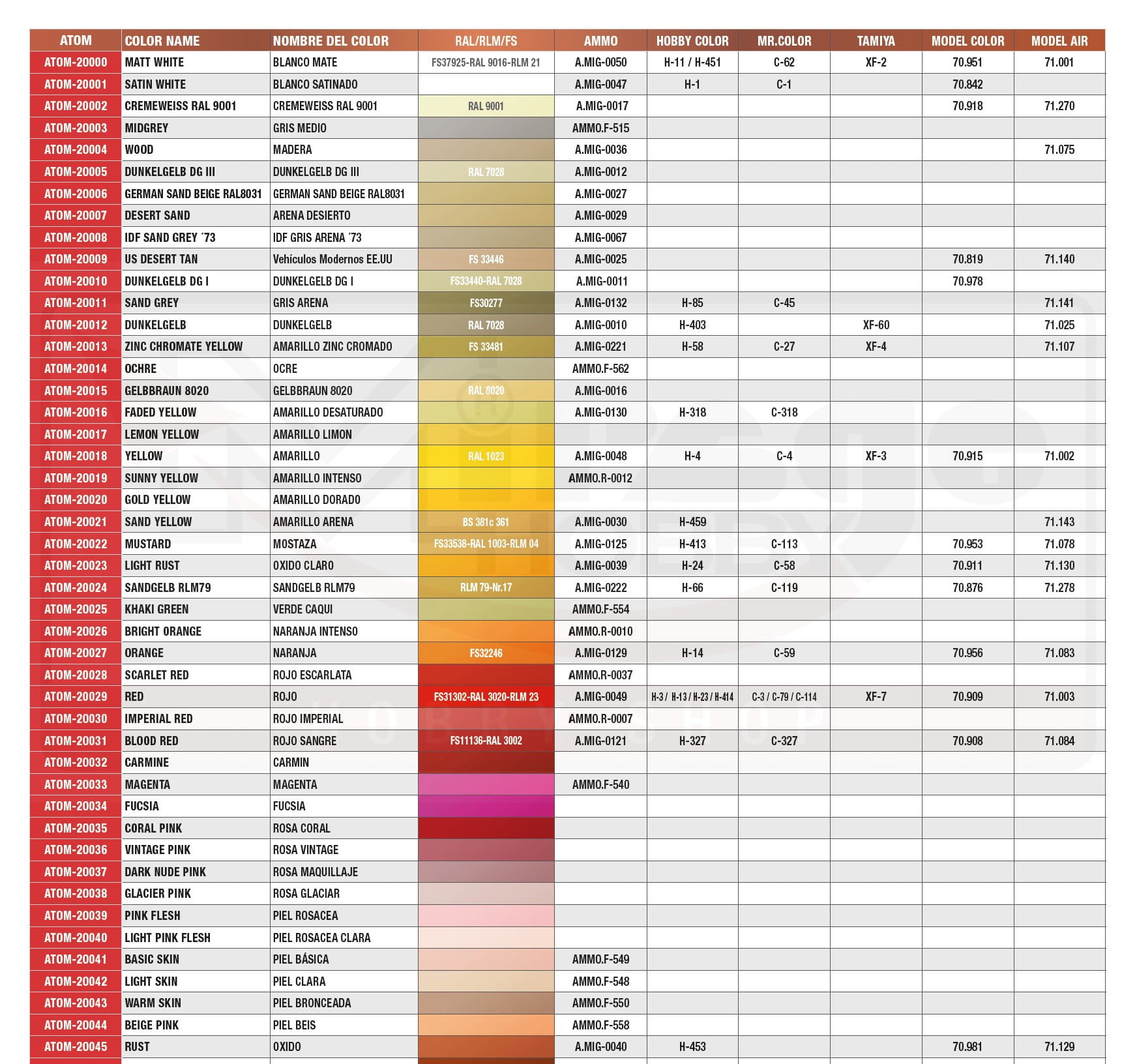 Gama farb Ammo ATOM obejmuje 180 kolorów obejmujących bardzo szeroki zakres chromatyczny, od kolorów podstawowych, jasnych i intensywnych, po kolory metaliczne i zmywalne. Zawiera również specjalnie opracowany rozcieńczalnik dla całego asortymentu. Ponadto gama ATOM obejmuje również historycznie dokładne kolory zarówno dla schematów kamuflażu samolotów, jak i opancerzonych pojazdów bojowych.