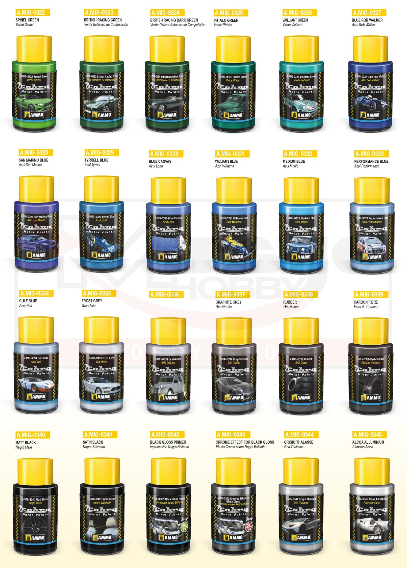 AMMO Cobra Motor Paints to gama akrylowych, nietoksycznych kolorów, idealnych do malowania każdego obszaru karoserii, felg, opon, silników i wnętrz pojazdów.