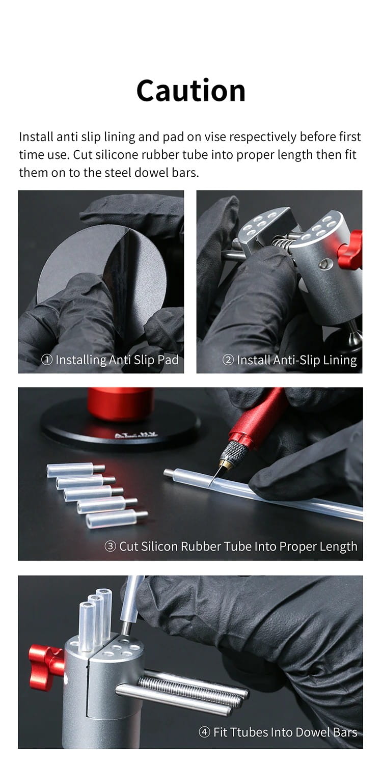 W zestawie dodatkowo znajdują się stalowe pręciki do zamocowania w głowicy, które umożliwią stabilne unieruchomienie elementów o nieregularnych kształtach. Dodatkowe silikonowe rurki zabezpieczają zamocowany element przed uszkodzeniem. Dołączona podstawka umożliwia bezpieczne i stabilne odłożenie uchwytu.