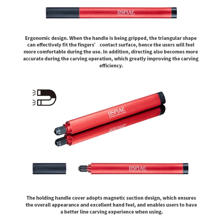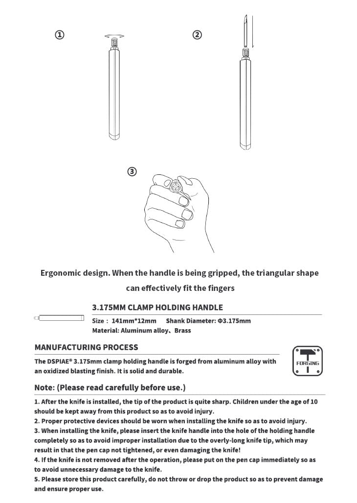 Metalowy uchwyt precyzyjny o trójkątnym, ergonomicznym kształcie. Przeznaczony do mocowania rysików linii podziału, dłutek, skrobaków itp. Produkt dedykowany do narzędzi DSPIAE serii HC, PB, KB,TS i innych o średnicy trzpienia 3,175 mm. Może być użyty również do mocowania rysików i podobnych narzędzi innych producentów (Tamiya, Border i inne)