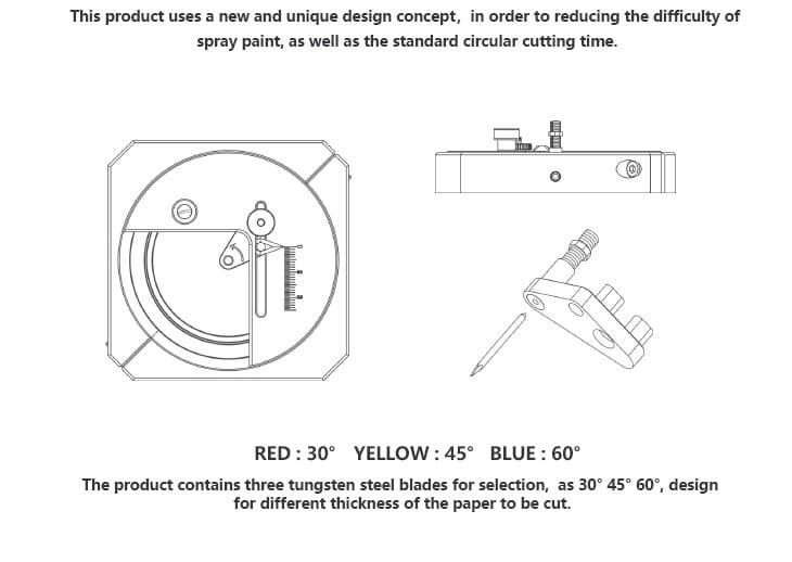 Cyrkiel posiada wygodną podziałkę do ustawienia średnicy wycinanego koła. Proces cięcia odbywa się płynnym ruchem nie strzępiąc ciętego materiału i zapewniając równe krawędzie. W zestawie znajdują się 3 ostrza ze stali wolframowej o kącie cięcia 30- 45- i 60 stopni dla materiałów o różnej grubości. Zapewnia szybkie i powtarzalne wycinanie, idealny np. do modeli kartonowych (wycinanie kół pojazdów), przygotowywania masek do malowania itp.
