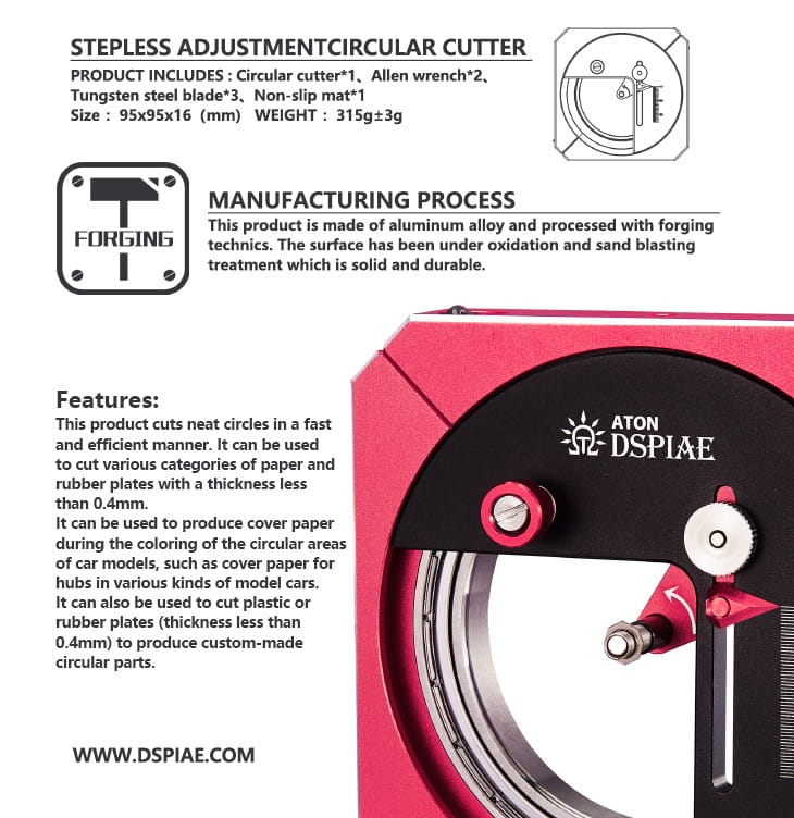 Nie nadaje się do cięcia materiałów innych niż papier i polistyren o grubości do 0.4mm. Do precyzyjnego ustawienia cyrkla można zastosować szablon DSPIAE MT-CL.