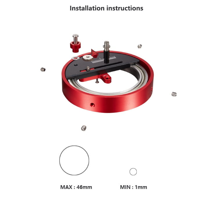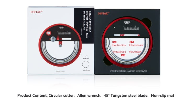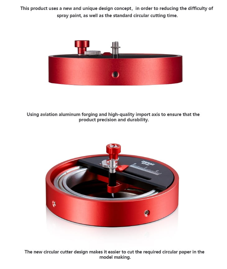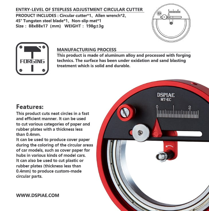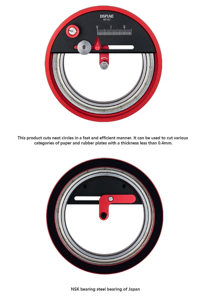 Korpus cyrkla wykonany jest z najwyższej jakości lotniczego aluminium, element tnący zamocowany na japońskim łożysku firmy NSK. Podziałka zapewnia wygodne i precyzyjne ustawienie średnicy wycinanego elementu. Proces cięcia odbywa się płynnym ruchem nie strzępiąc ciętego materiału i zapewniając równe krawędzie. W zestawie znajduje się ostrze ze stali wolframowej o kącie cięcia 45 stopni.