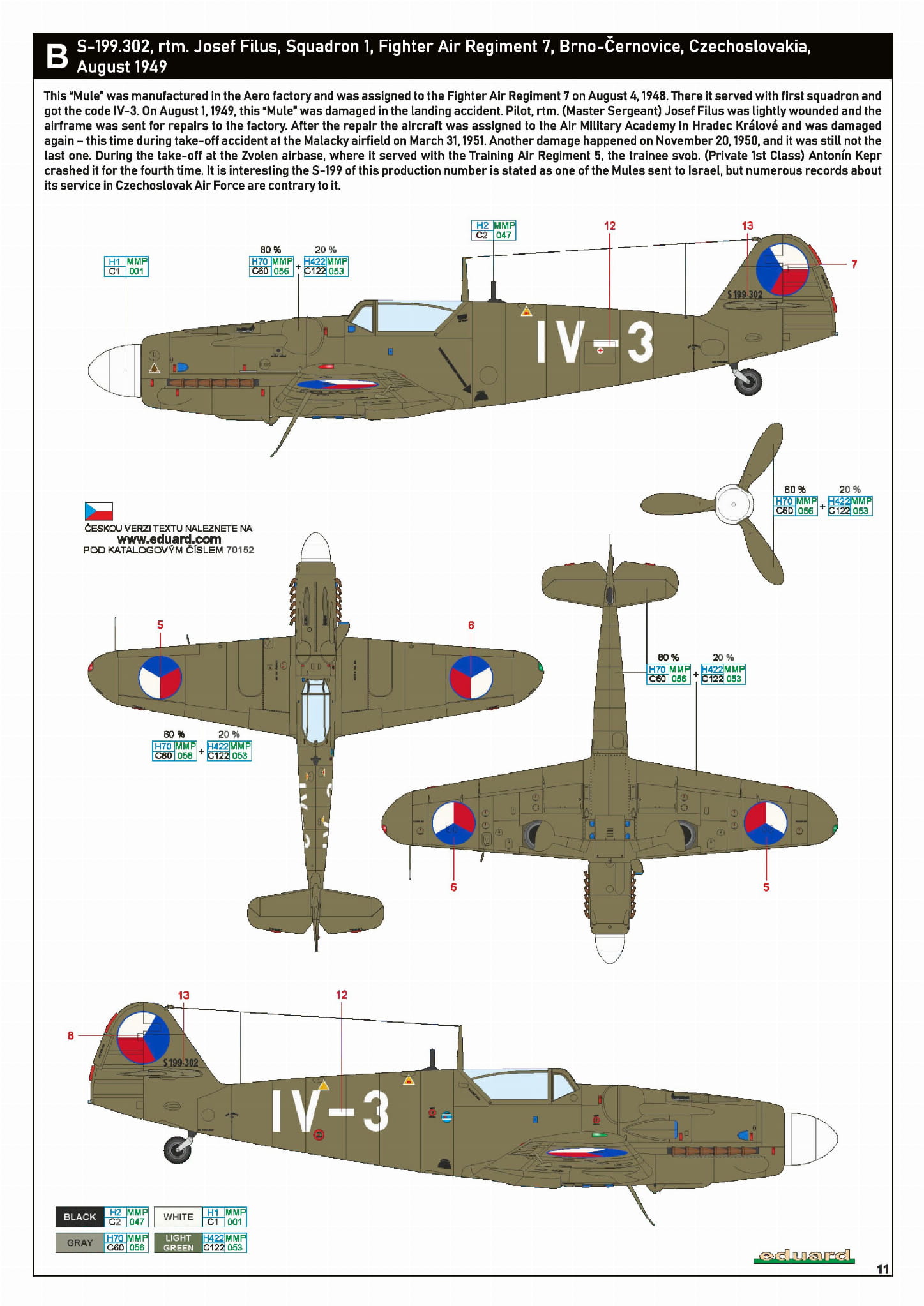 - Zadaszenie Avia S-199 ERLA 1/72 - S-199.302, rtm. Josef Filus, Eskadra 1, 7 Pułk Lotnictwa Myśliwskiego, Brno-Černovice, Czechosłowacja, sierpień 1949