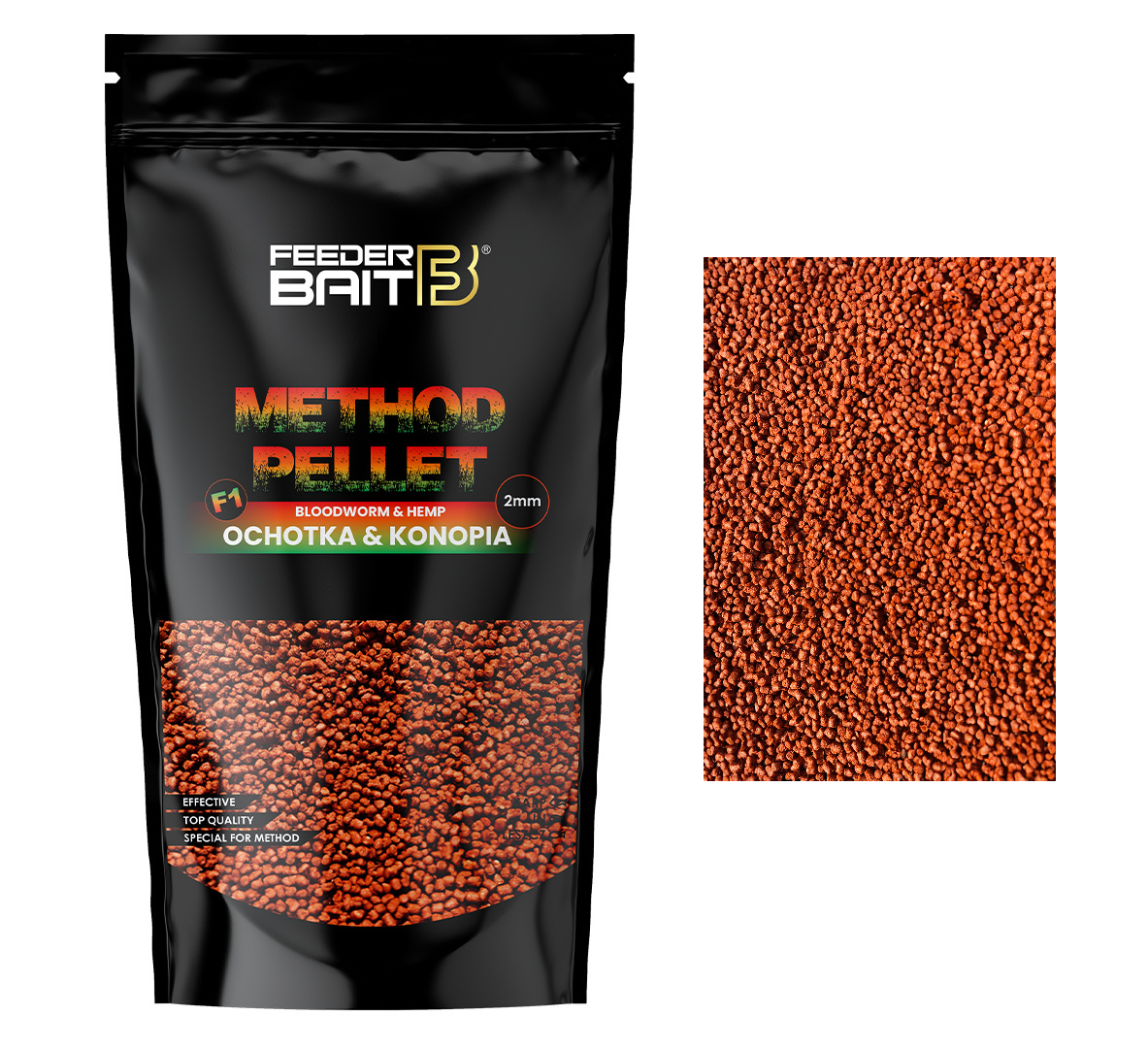Pellet Feeder Bait Method Pellet 2mm - F1 Ochotka/Konopia - w pelletach zastosowano technologię wolnego uwalniania. Struktura pelletu została tak opracowana aby rozpadał się on warstwa po warstwie stale uwalniając aromat. Doskonale sprawdza się od wabienia dużych ryb i utrzymania ich w polu łowienia. Najlepiej stosować w połączeniu z Zalewą Epidemia i F1 Ochotka Konopia.