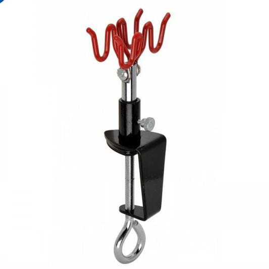 Specjalistyczny stojak umożliwiający odłożenie do dwóch aerografów, przykręcany do krawędzi blatu roboczego. System mocowania działa sprawnie, do pewnego stopnia jest regulowany oraz został zaopatrzony w antypoślizgową podkładkę, która korzystnie wpływa na jego stabilność.
