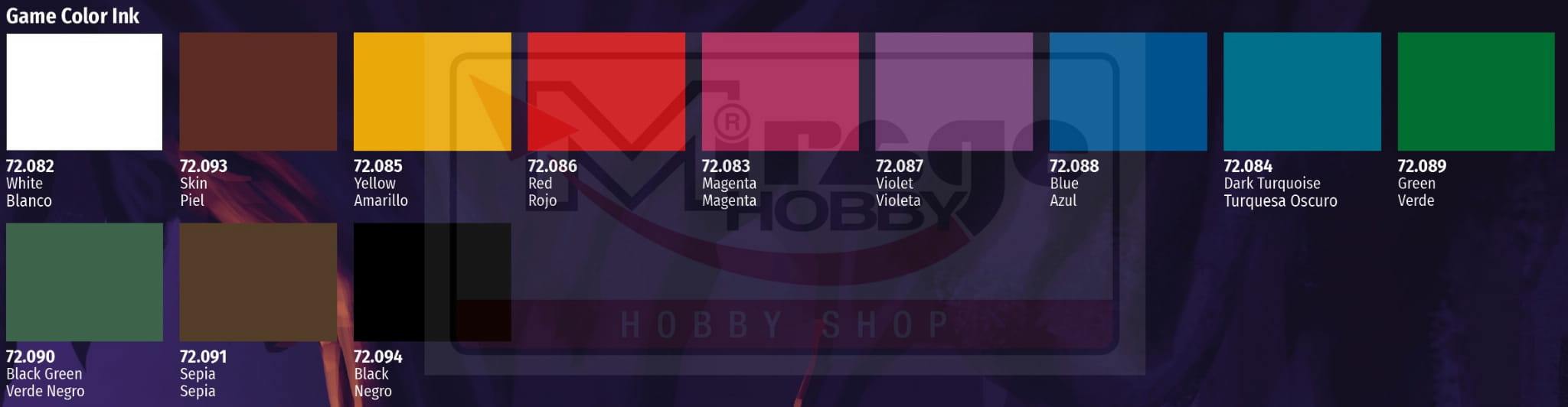 Vallejo Game Color Ink to przezroczyste kolory o wysokim stężeniu pigmentu, które można stosować do wzmacniania, cieniowania, ujednolicania i modyfikowania odcieni, a także do tworzenia efektów cieniowania i zmywania.