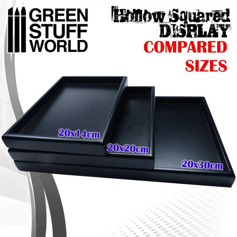Pusty kwadratowy ekspozytor z drewna MDF, z pustym wnętrzem, idealny do eksponowania figurek lub innych elementów, które mogą wymagać głębokości lub do przechowywania płynów. Podstawa pokryta jest cienkim, ciemnozielonym dywanem.