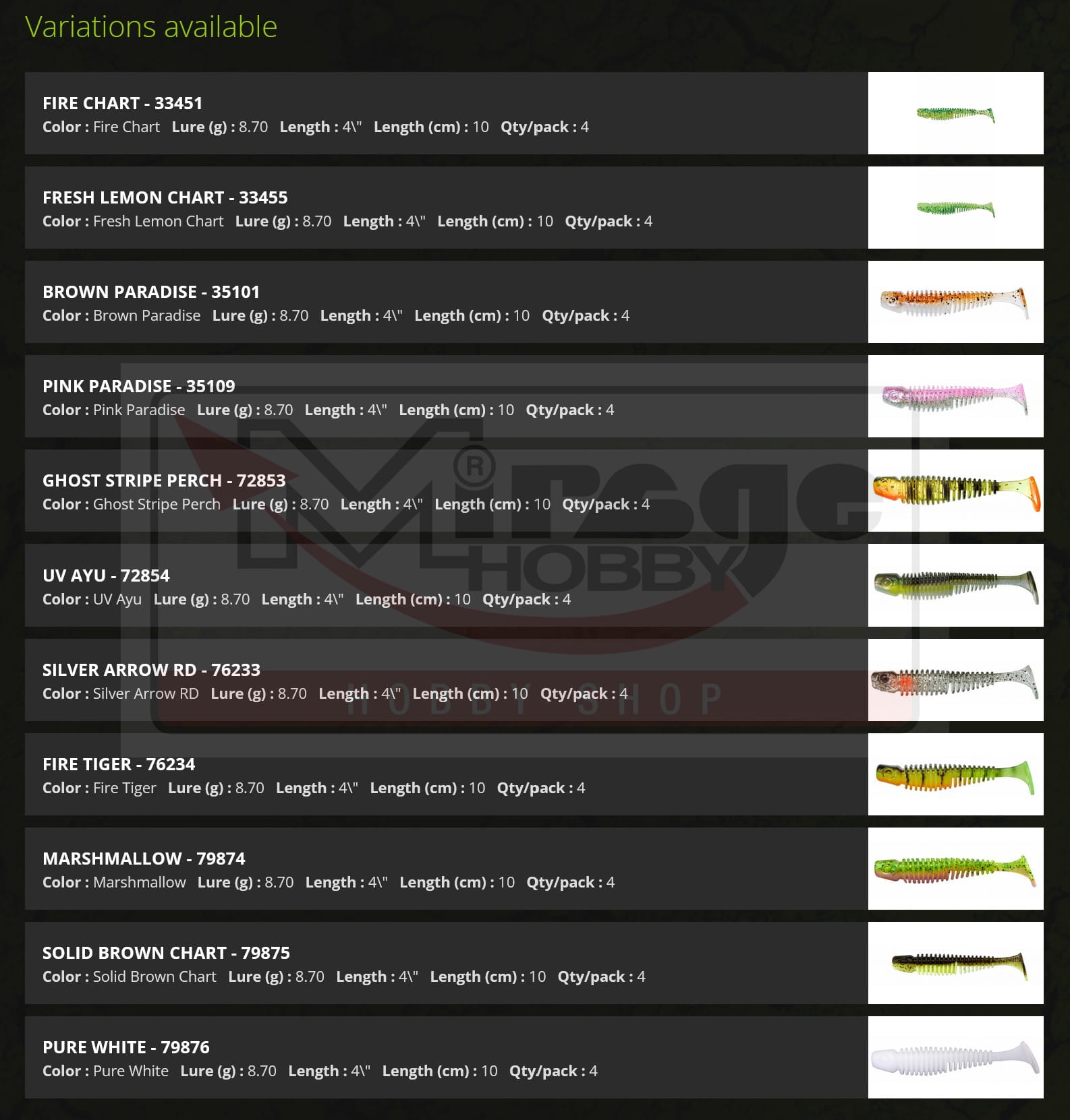 Gdy prowadzimy ją szybciej, umieszczony pod kontem 90 stopni ogonek wprawia cały korpus w drgania. Korpus został zbudowany jak szkielet, więc do produkcji użyto stosunkowo niewiele materiału, co dodatkowo je wzmacnia. Boki przynęty są żebrowane co sprawia, że jej powierzchnia jest bardziej miękka i drapieżniki nie wypluwają raz pobranej przynęty. Anyżkowy smak i aromat.