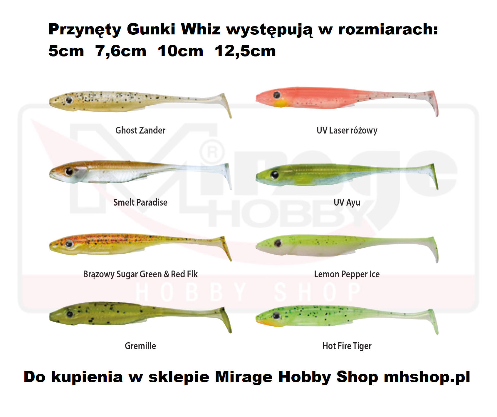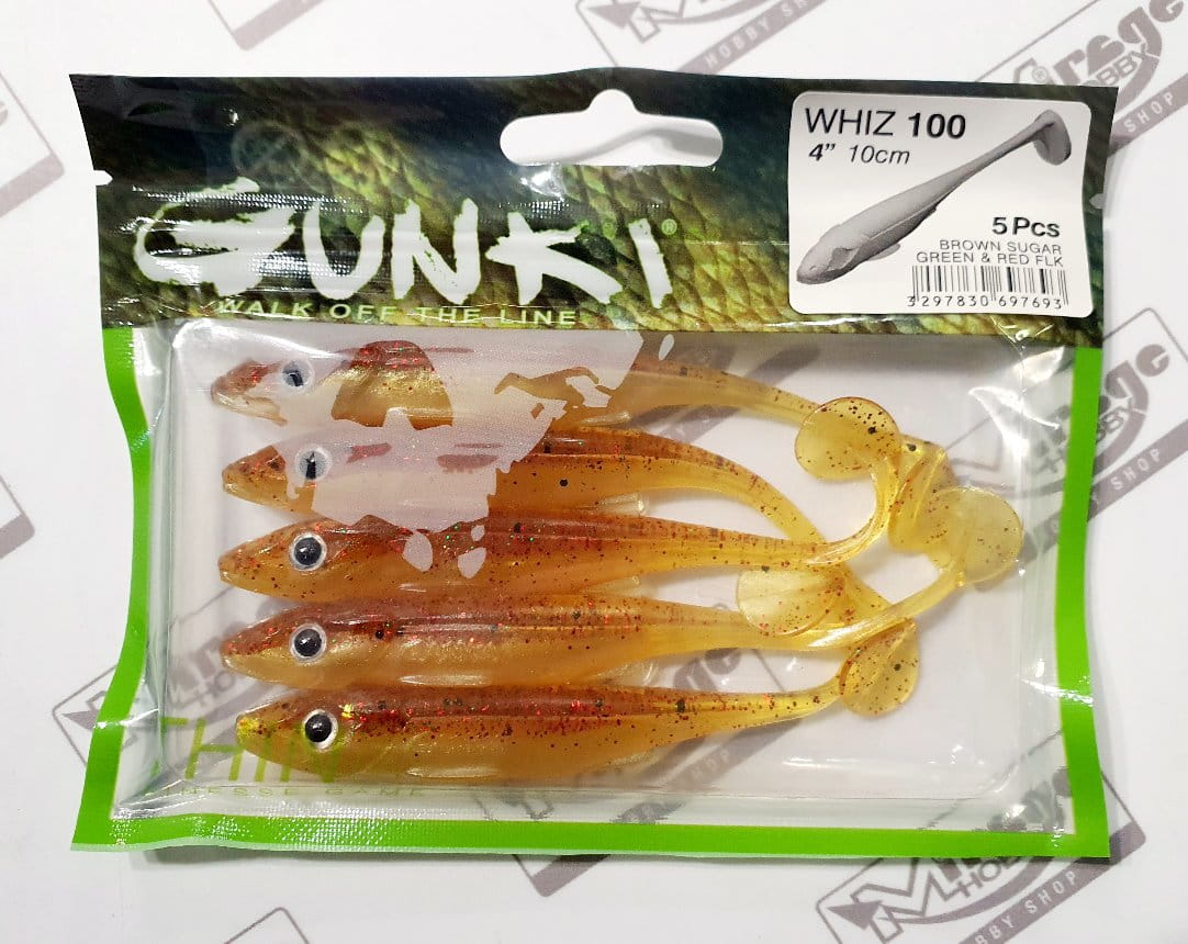 Gumy Gunki Whiz mają sylwetkę identyczną, jak jej pierwowzór - duże, realistyczne oko. Zaokrąglona płetwa piersiowa została zaprojektowana aby przyciągnąć drapieżniki żerujące na narybku. Długi ogon typu shad emituje żywe drobne wibracje, które działają szczególnie skutecznie na okonie i sandacze.