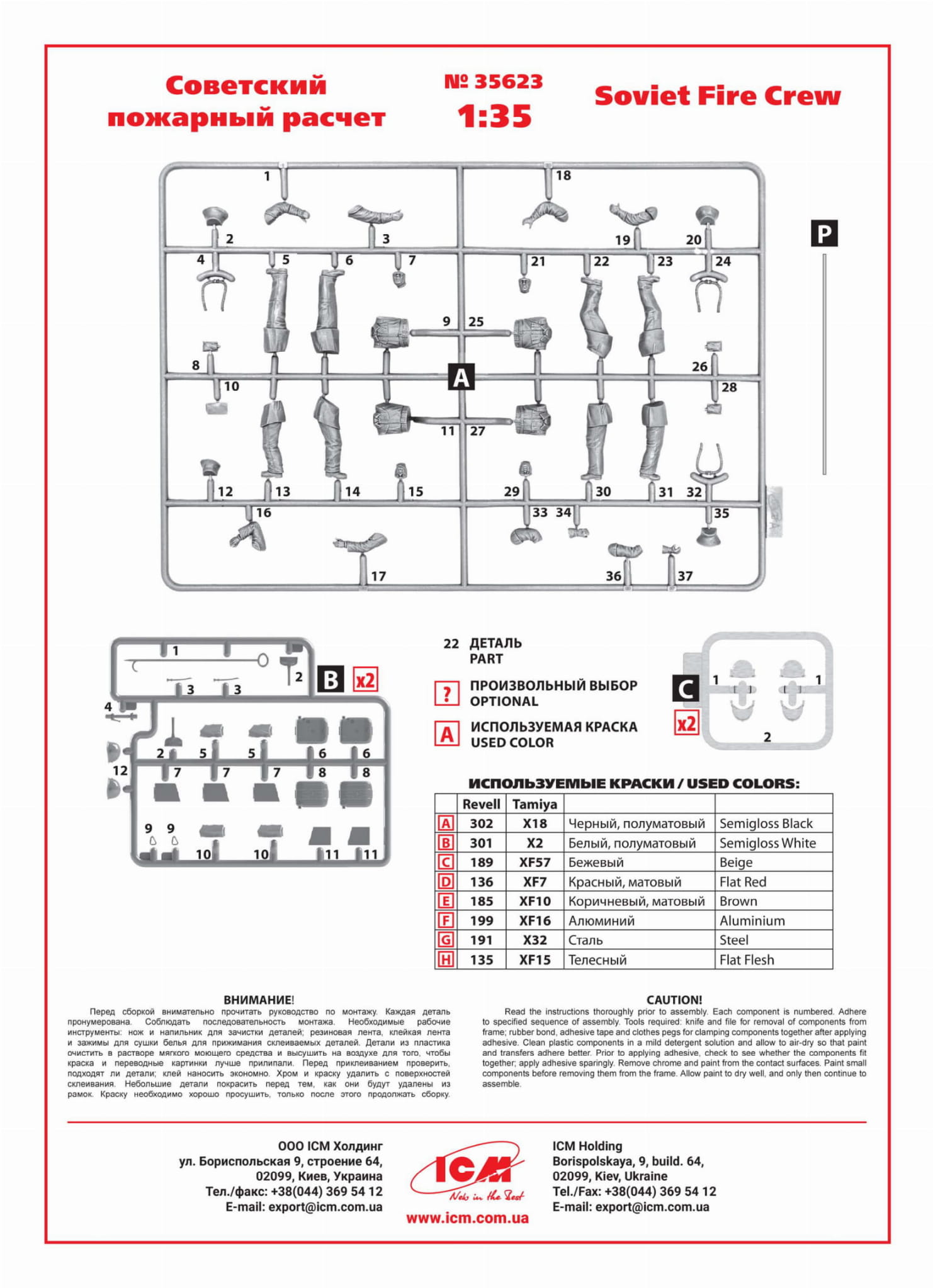 Zestaw zawiera 37 części do montażu 4 figurek radzieckich strażaków z lat 80-tych oraz 27 części akcesoriów.