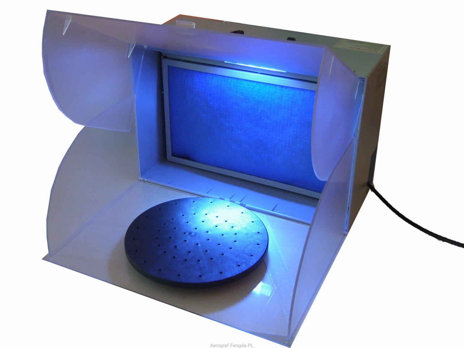 Profesjonalnie wykonana kabina malarska przeznaczona do malowania elementów mini pistoletami lakierniczymi oraz aerografami. Posiada obrotową platformę o średnicy 220mm pozwalającą na wygodnie malowanie przedmiotów bez brudzenia rąk.