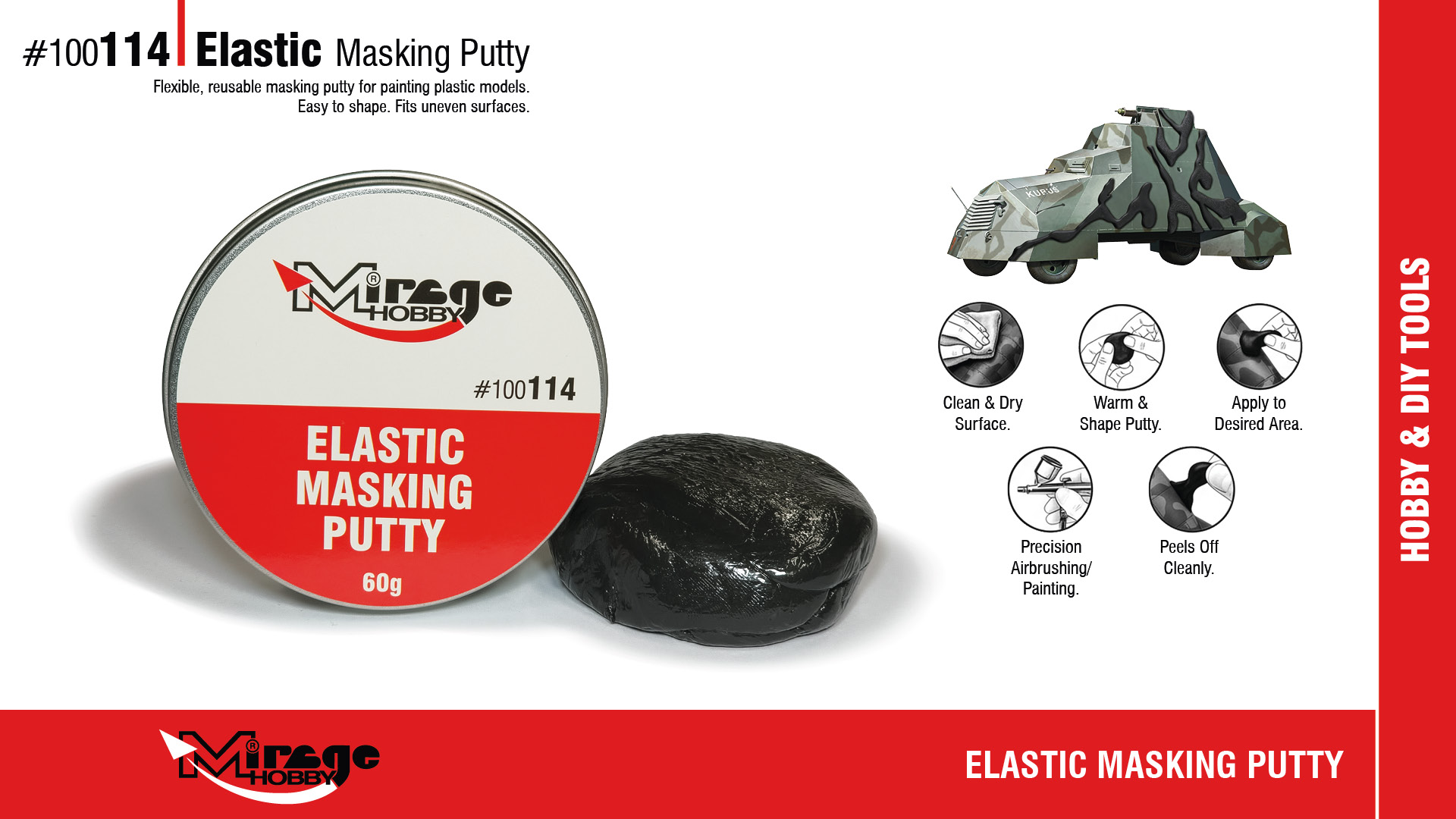 Masa Elastic Masking Putty od Mirage Hobby to elastyczna, wielokrotnego użytku masa maskująca przeznaczona do precyzyjnego malowania modeli plastikowych. Idealna do wykonywania miękkich przejść kolorów, kamuflaży oraz zabezpieczania nieregularnych powierzchni podczas malowania aerografem i pędzlem.