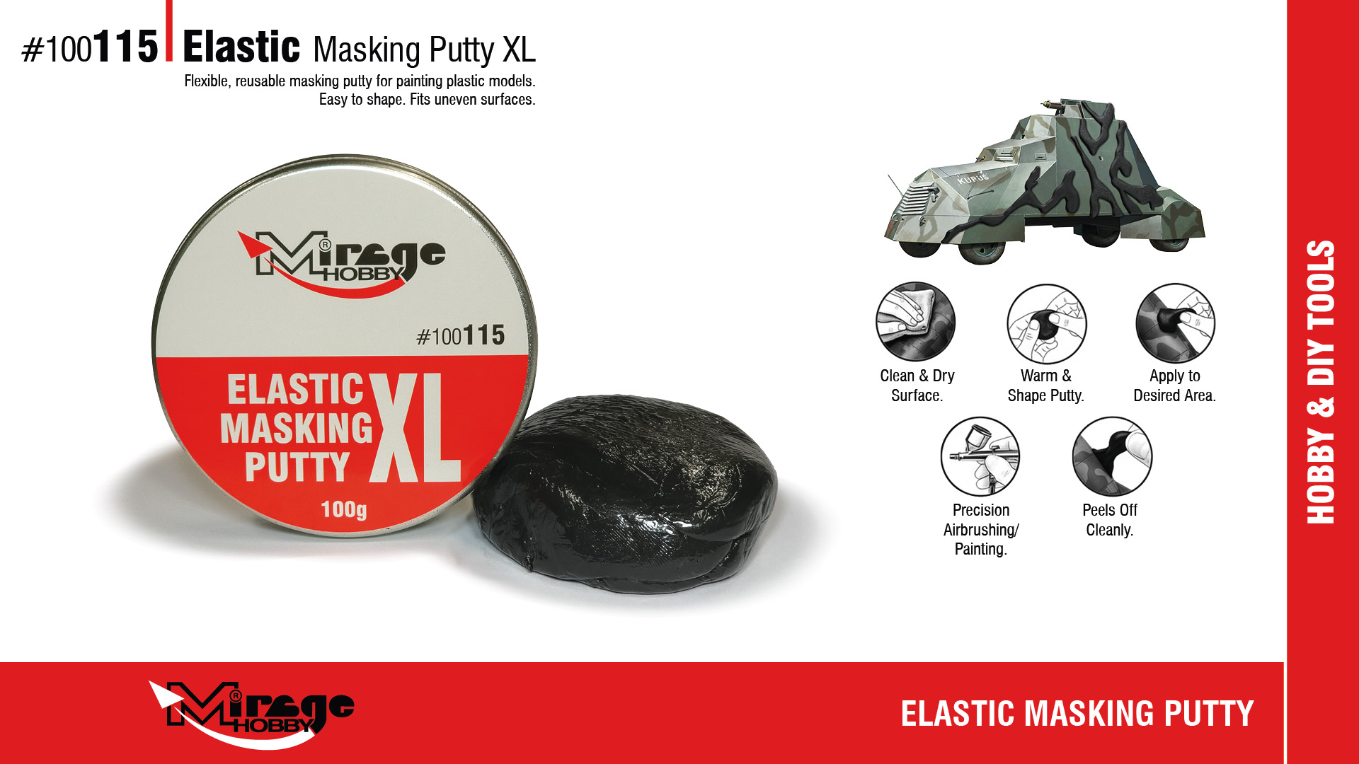 Masa Elastic Masking Putty od Mirage Hobby to elastyczna, wielokrotnego użytku masa maskująca przeznaczona do precyzyjnego malowania modeli plastikowych. Idealna do wykonywania miękkich przejść kolorów, kamuflaży oraz zabezpieczania nieregularnych powierzchni podczas malowania aerografem i pędzlem.