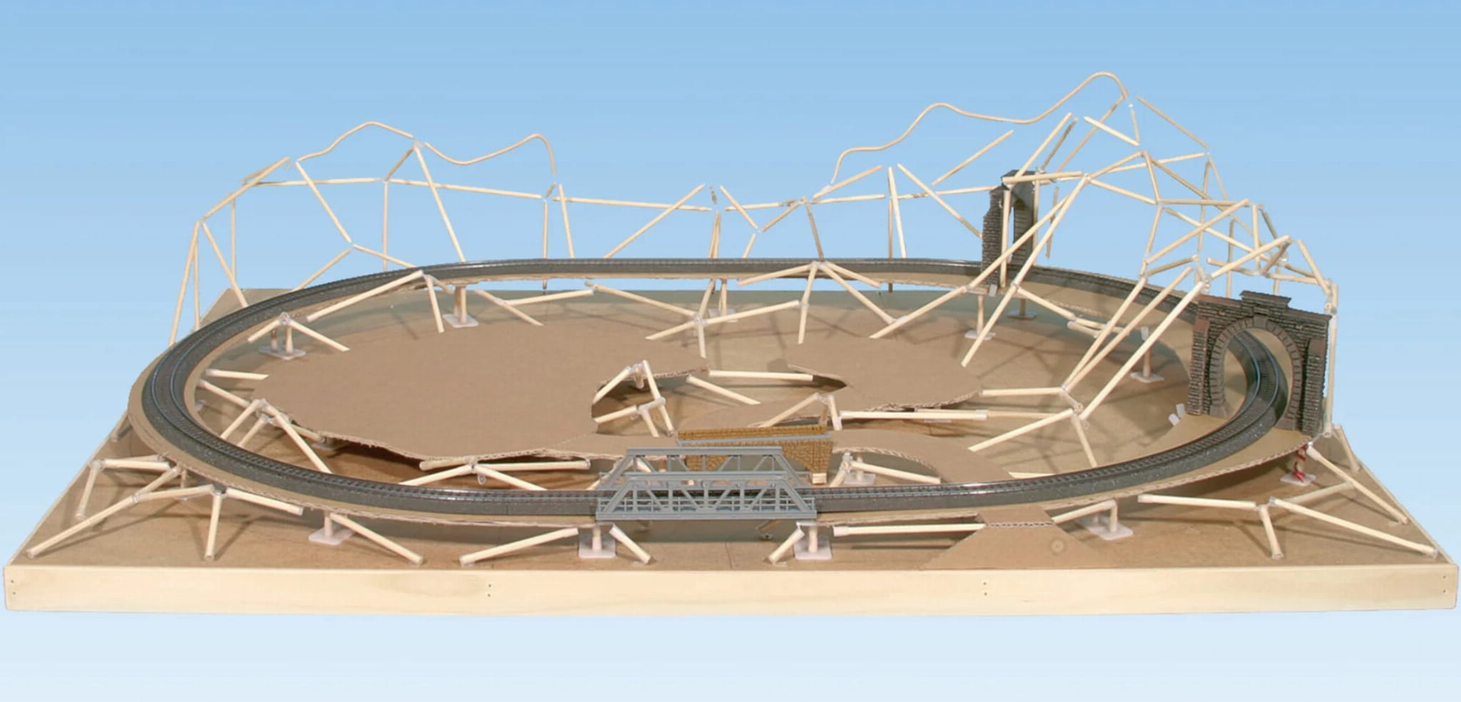 Po jeździe próbnej zaczynasz projektować krajobraz – nad i wokół układu torów. Pierwszą rzeczą, którą robisz, jest ustawienie struktury przypominającej namiot. Ponieważ okrągłe słupki są wkładane tylko w elementy łączące, konstrukcję można w każdej chwili poprawić i zmienić. Dzięki temu systemowi ramowemu późniejsze przeprojektowanie jest równie łatwe, jak bieżąca „konserwacja” szyn i całej technologii. Kiedy rama jest na swoim miejscu, jest następnie pokryta bibułą krepową NOCH Landscape i tworzy teraz „pusty teren”, który możesz dalej rozwijać zgodnie z własnymi życzeniami.
