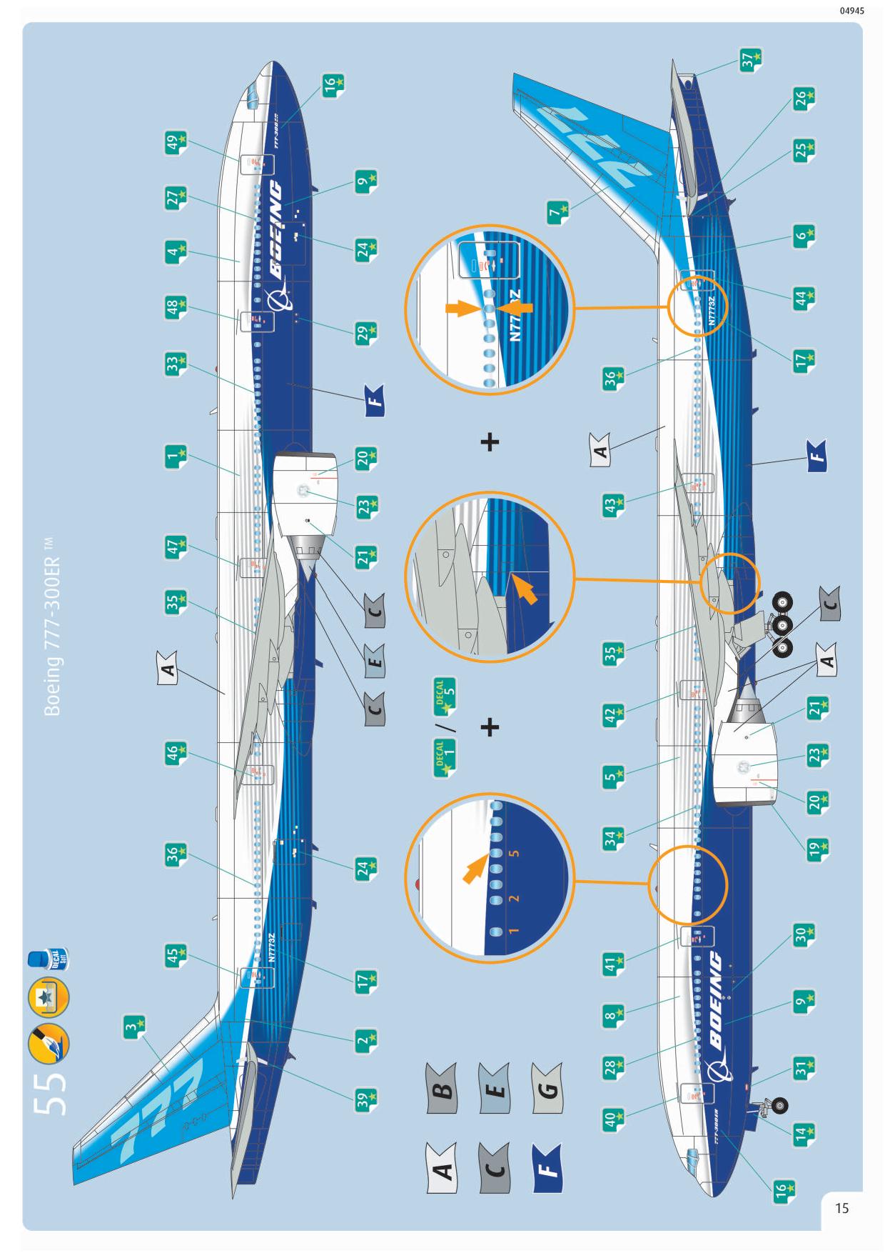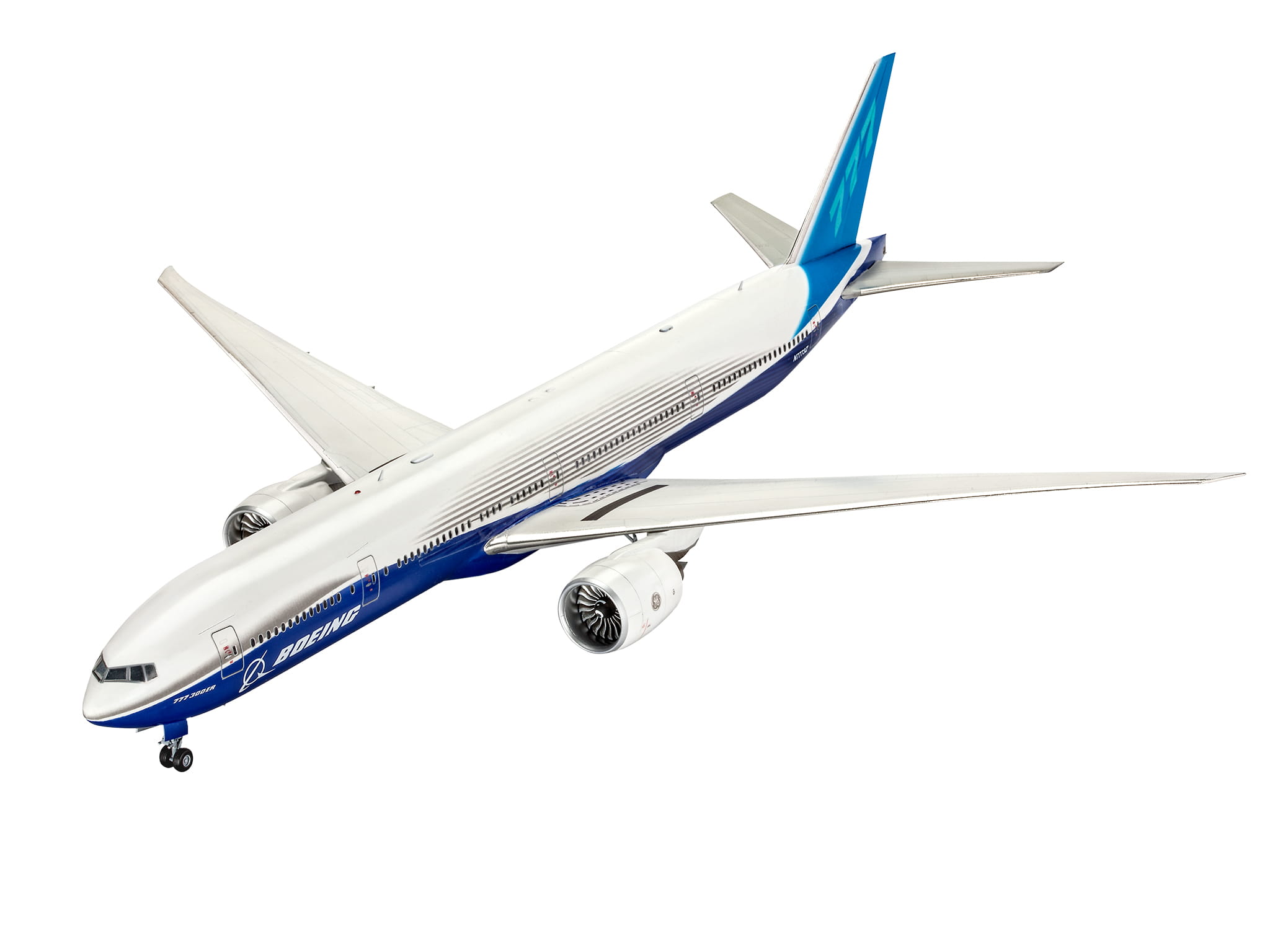 Modelowy zestaw konstrukcyjny Boeinga 777-300ER, dwusilnikowego szerokokadłubowego samolotu pasażerskiego dalekiego zasięgu z miejscami siedzącymi dla maksymalnie 550 pasażerów. Wersja 777-300ER ma większą powierzchnię skrzydeł i dodatkowe zbiorniki paliwa, co daje zasięg 14600 km (9072 mil)