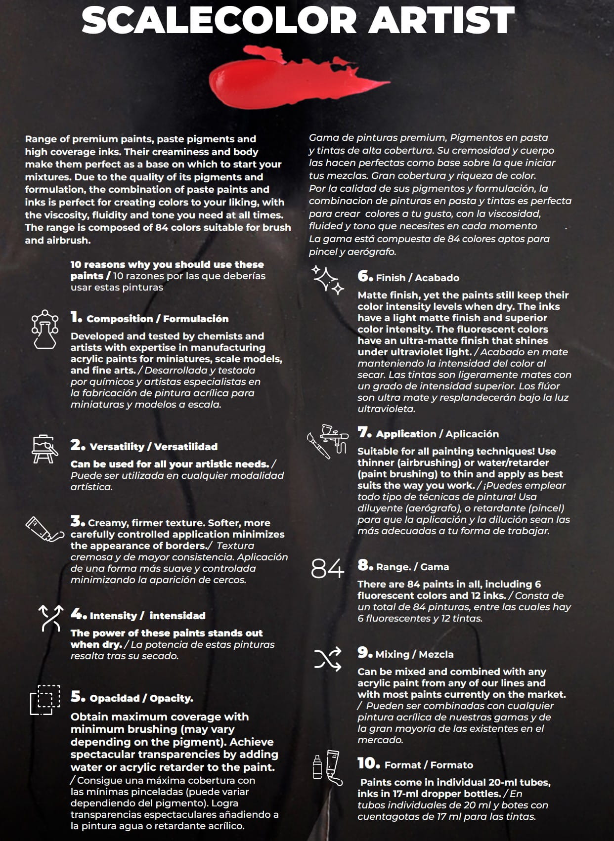 Seria Scalecolor Artist to farby przygotowane do malowania pędzelkiem. Posiadają dużo pigmentu przez co są bardzo wydajne. Do malowania aerografem wymagają rozcieńczenia z wykorzystaniem rozcieńczalnika do farb akrylowych.
