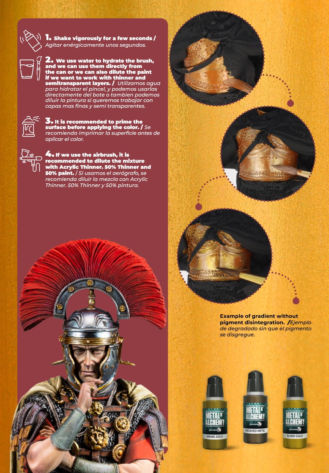 Gama składa się z 24 kolorów odpowiednich do malowania pędzlem i aerografem (po rozcieńczeniu). Różnorodność odcieni pozwala malować wszystkie rodzaje metalicznych kolorów.