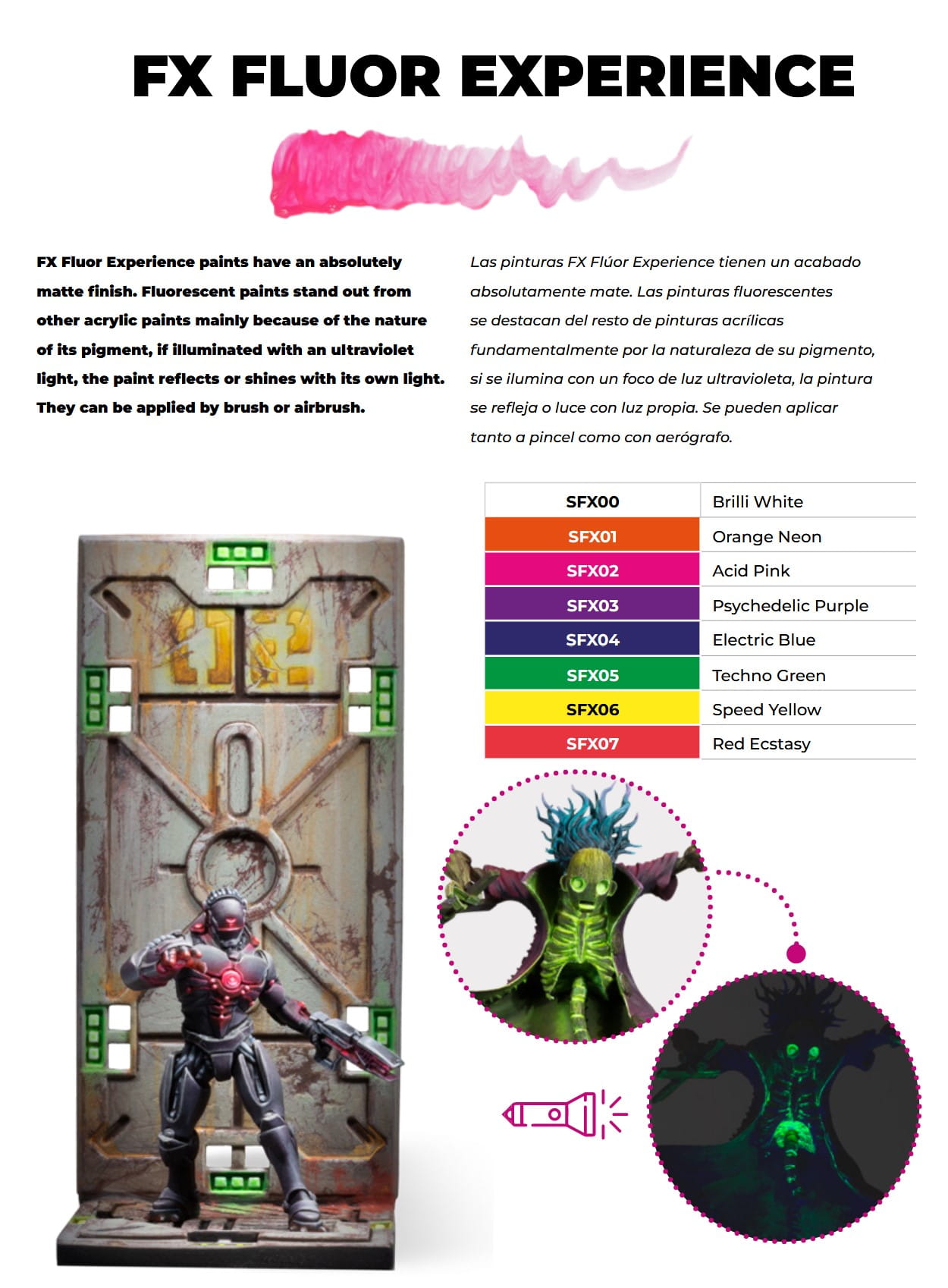 Farby fluorescencyjne wyróżniają się na tle innych farb akrylowych głównie ze względu na charakter pigmentu, który po oświetleniu światłem ultrafioletowym odbija lub świeci własnym światłem. Można je nakładać pędzlem lub aerografem.