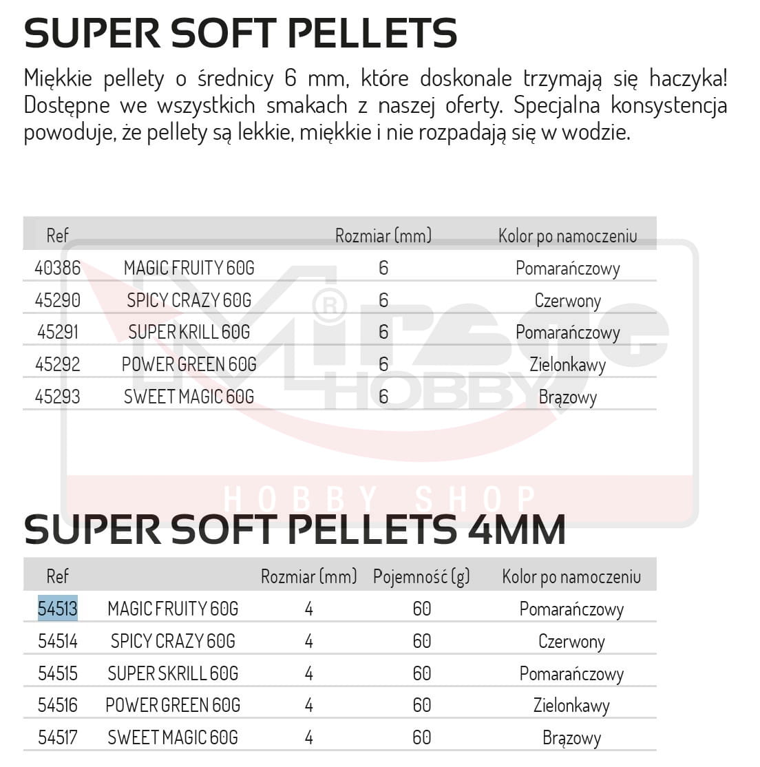 Sensas Super Soft Pellets mają specjalną strukturę, która sprawia, że te lekkie, ale miękkie pellety utrzymują się na haku i nie rozpadają się w wodzie. Te miękkie pellety haczykowe są dostępne w rozmiarach 4 i 6 mm.