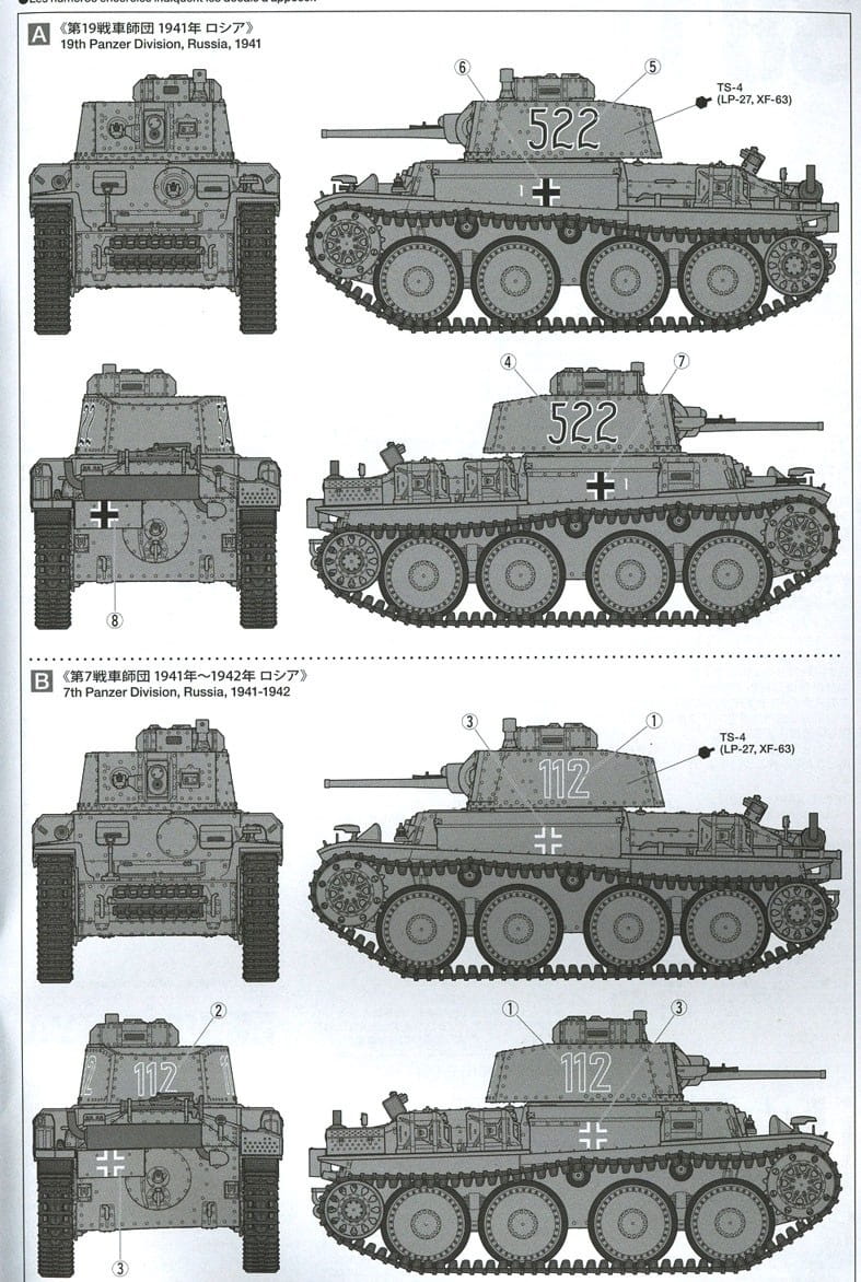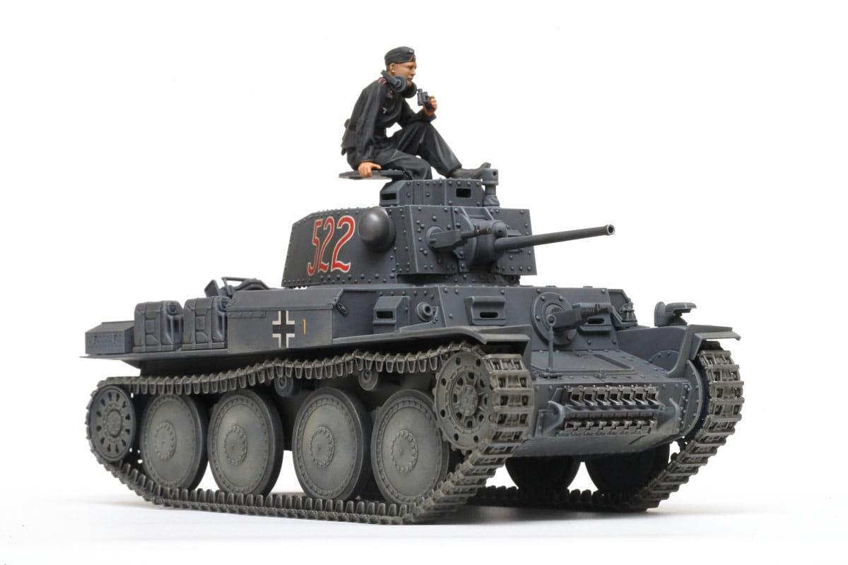Ten model Tamiya odtwarza jeden z niesamowitych czołgów lekkich w Niemczech. Pojazd ten w rzeczywistości rozpoczął życie jako czołg lekki opracowany dla Czechosłowacji, ale został przyjęty i przemianowany na 38(t) przez siły niemieckie po okupacji kraju w 1939 roku. Był wyposażony w działo główne 3,7 cm i mógł osiągać prędkość do 42 km/h napędzany silnikiem o mocy 125 KM. Wyprodukowano szereg wariantów, z których Ausf. E/F 38(t) wyprodukowano w ciągu jednego roku od listopada 1940 roku; miały ulepszony pancerz i zostały wrzucone do konfliktu z siłami sowieckimi po rozpoczęciu operacji Barbarossa.