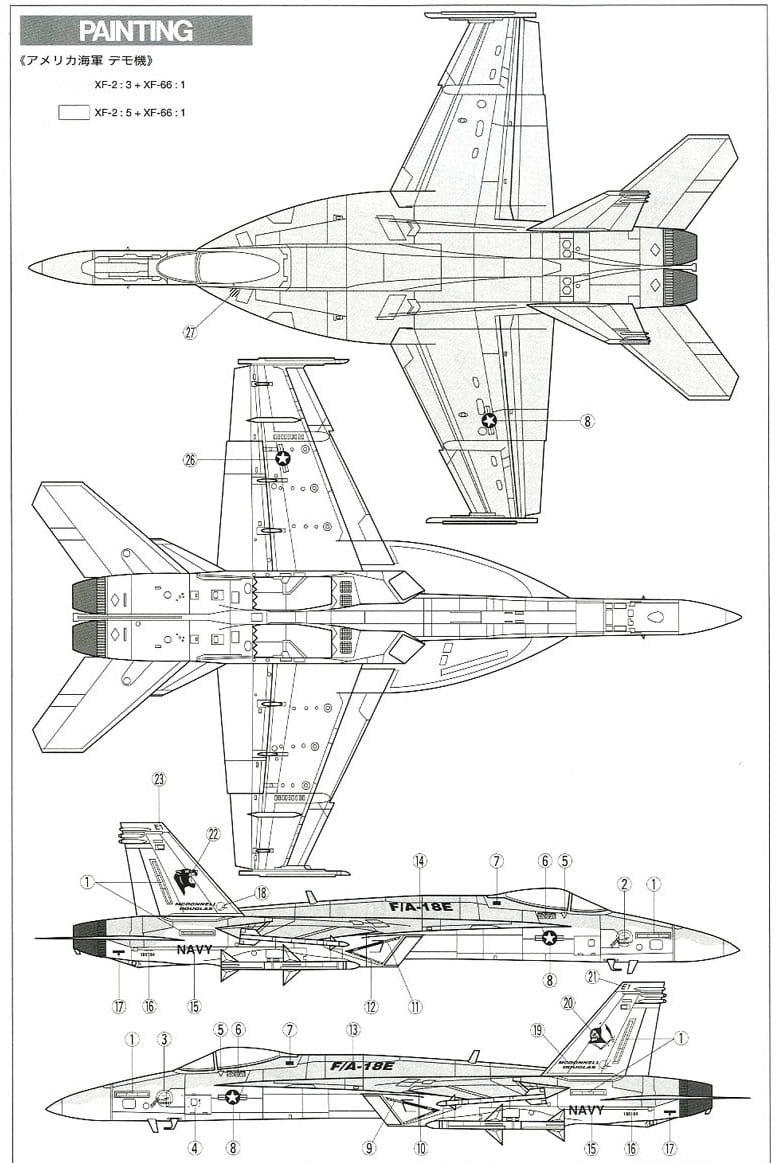 Ten model dokładnie przedstawia ostrą sylwetkę myśliwca odrzutowego marynarki wojennej USA z XXI wieku. Możesz montować klapy na krawędziach natarcia i czaszy w pozycji otwartej lub zamkniętej. Dodatkowy zbiornik paliwa i uzbrojenie, takie jak pociski powietrze-powietrze sidewinder, mają bogate wykończenie. W zestawie kalkomanie przedstawiające samolot demonstracyjny Marynarki Wojennej USA.