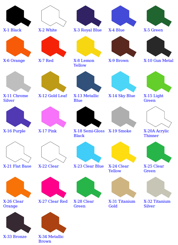 Kolory oznaczone X mają błyszczące wykończenie, podczas gdy kolory oznaczone XF są wykończone matowo.