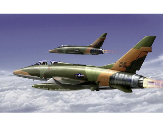 F-100 Super Saber był naddźwiękowym myśliwcem odrzutowym, który służył w USAF. pierwszy lot odbył się 25 maja 1953 r., a następnie pierwszy produkcyjny F-100 9 października 1953 r. Dwumiejscowy trener F-100F wszedł do służby w 1958 r. Pozostaje to w większości ta sama broń i ulepszenia płatowca co F-100D.