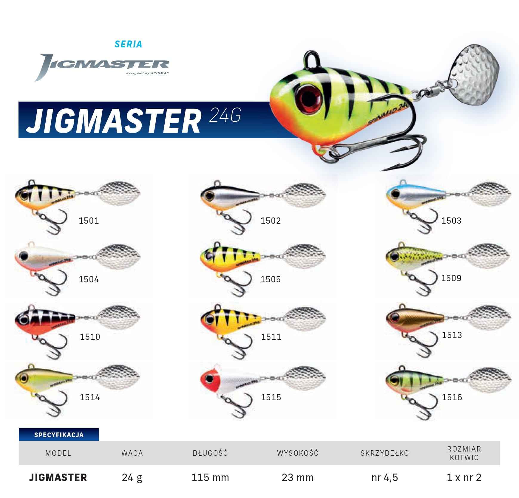 Przynęty Spinmad Jigmaster to wirujące ogonki zaprojektowane do łowienia szczupaków. Zastosowanie nowej technologii i materiałów pozwoliło na powiększenie wabików do ulubionych szczupaczych rozmiarów nie zwiększając ich wagi. Dzięki temu wabiki doskonale spisują na "szczupakowych" miejscówkach.