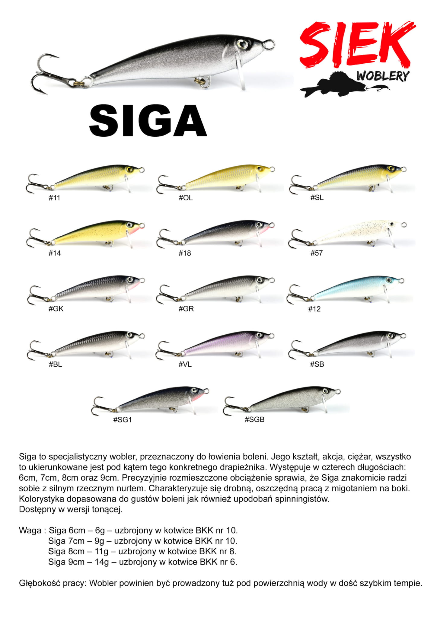 Jego kształt, akcja, ciężar, wszystko to ukierunkowane jest pod kątem tego konkretnego drapieżnika. Precyzyjnie rozmieszczone obciążenie sprawia, że Siga znakomicie radzi sobie z silnym rzecznym nurtem. Charakteryzuje się drobną, oszczędną pracą z migotaniem na boki. Kolorystyka dopasowana do gustów boleni jak również upodobań spinningistów. Dostępny w wersji tonącej.