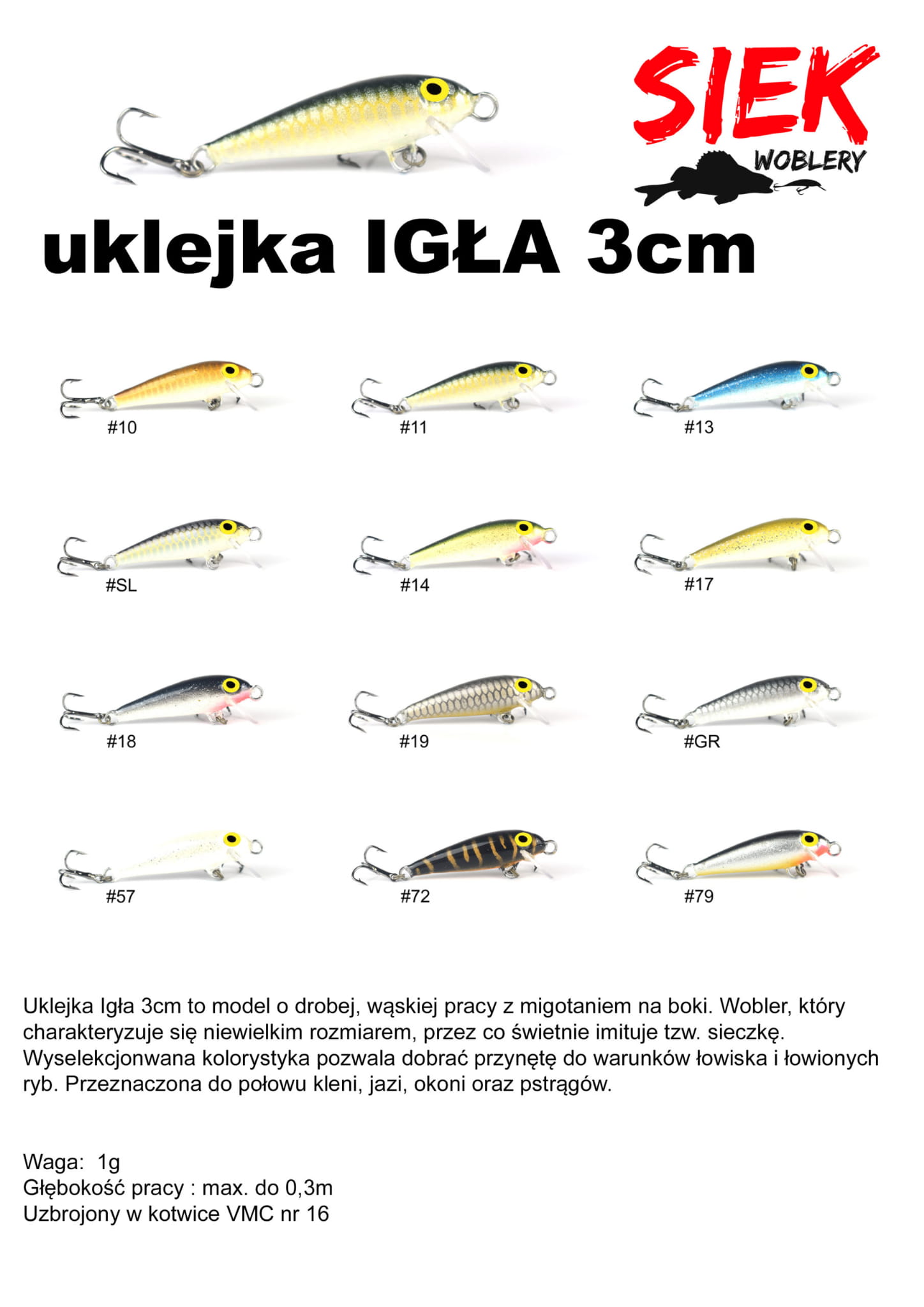 Wobler Uklejka IGŁA charakteryzuje się niewielkim rozmiarem, przez co świetnie imituje tzw. sieczkę. Wyselekcjonowana kolorystyka pozwala dobrać przynętę do warunków łowiska i łowionych ryb.