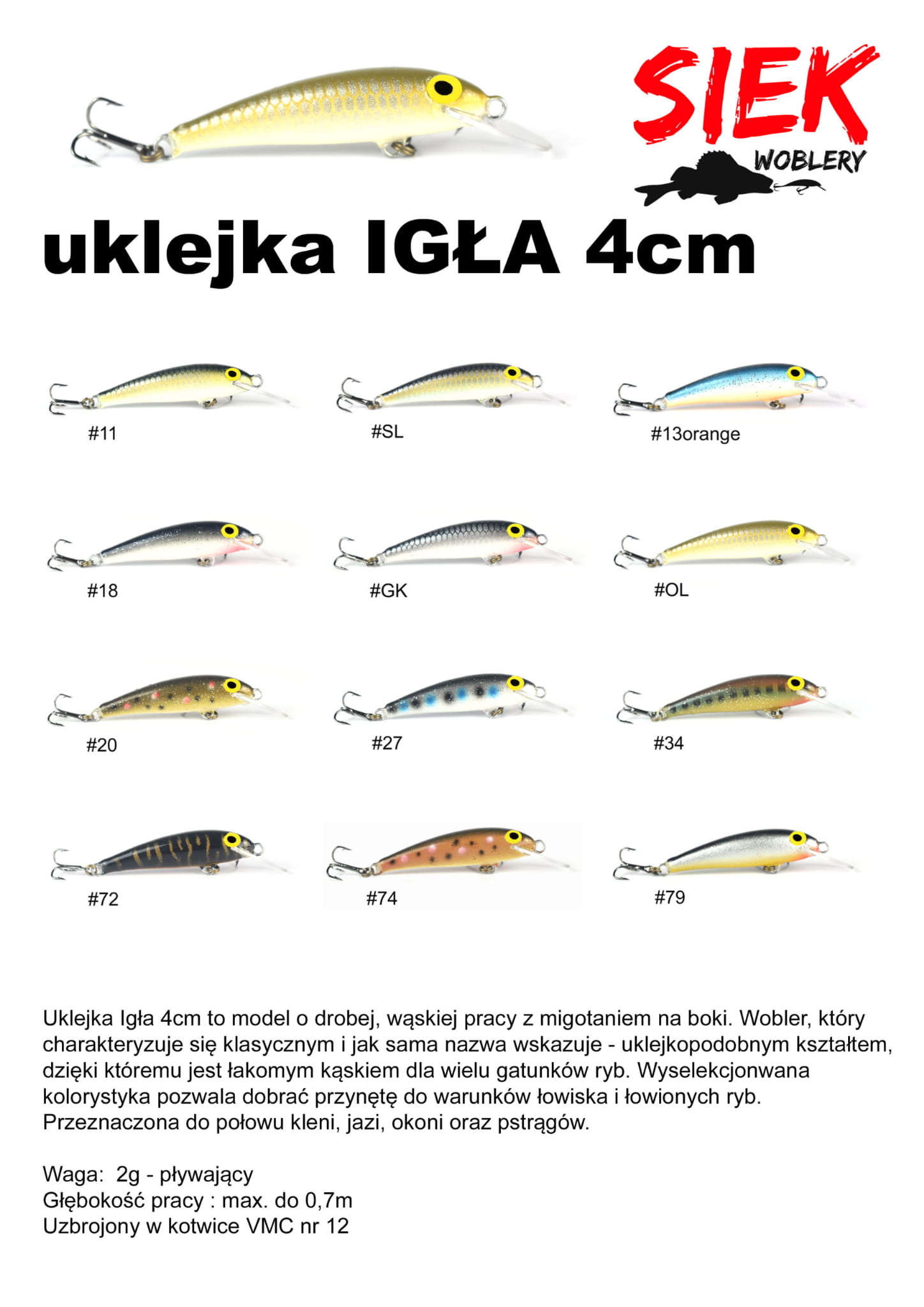 Wobler Uklejka IGŁA charakteryzuje się niewielkim rozmiarem, przez co świetnie imituje tzw. sieczkę. Wyselekcjonowana kolorystyka pozwala dobrać przynętę do warunków łowiska i łowionych ryb.