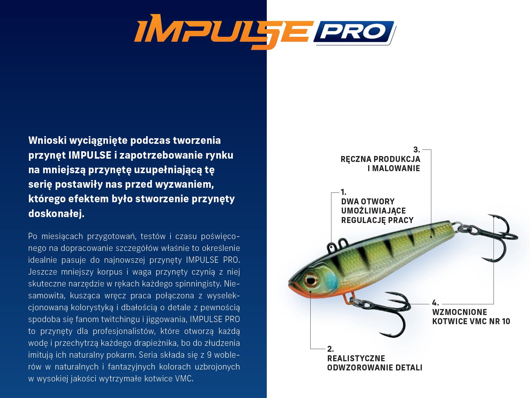 Impulse PRO poradzi sobie również bardzo dobrze z rzecznym nurtem. Jest on doskonałą przynętą do łowienia pstrągów. 5 cm to znakomity rozmiar, aby skusić te ryby. Najlepszy będzie on do obławiania głębszych dołków i rynien. Dzięki swojej wadze bardzo szybko zanurkuje, gdy wrzucisz go w potencjalne miejsce bytowania pstrąga. W dołku prowadź go lekkimi podszarpnięciami, wzdłuż rynny zaś staraj się prowadzić jednostajnym tempem. Jego wibracja spowoduje, że pstrąg na pewno się do niego podniesie.